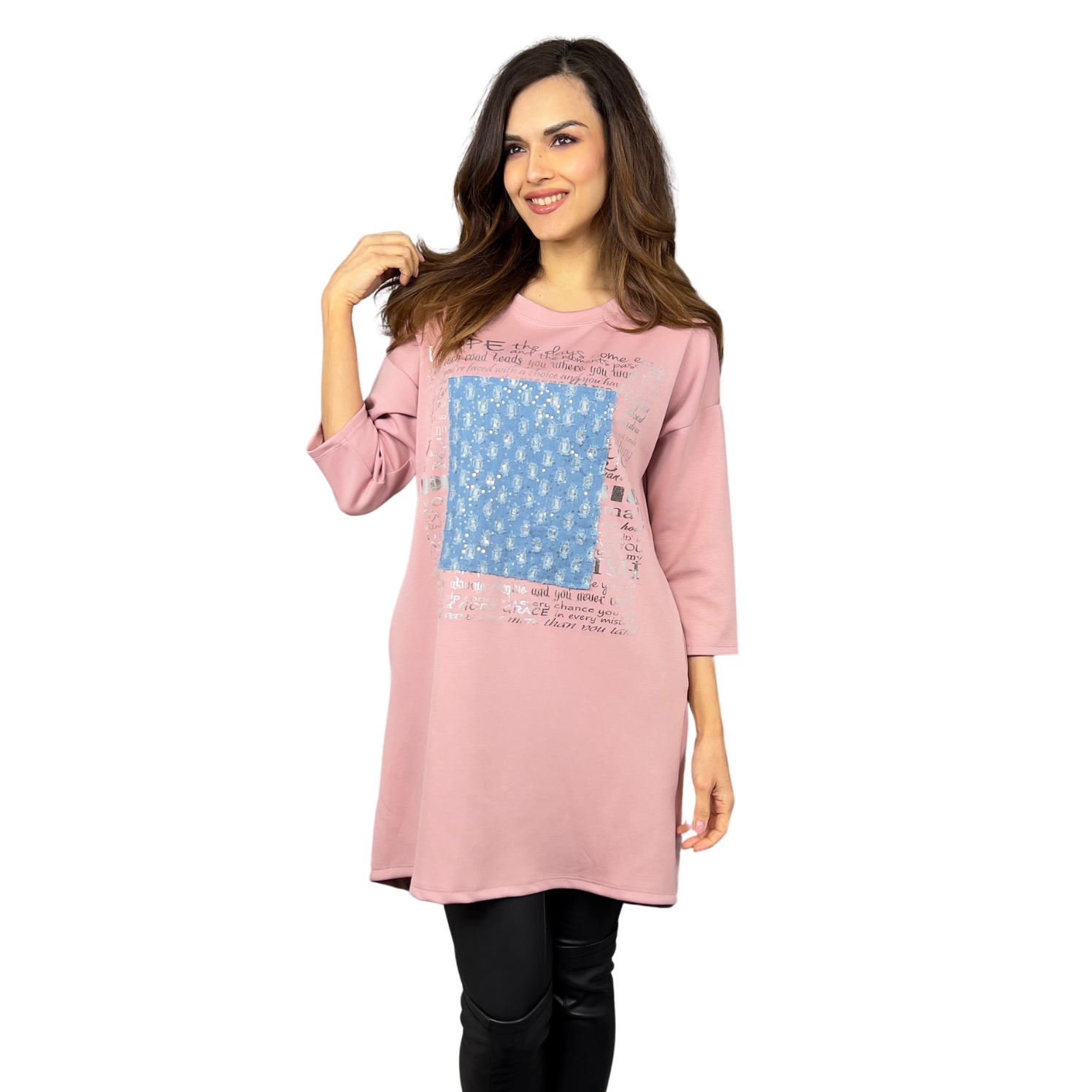 Mikinové šaty Defne spojují volný, moderní střih s ležérní elegancí. Díky dropshoulder rukávům a prodloužené délce jsou skvělou volbou pro ženy, které hledají pohodlí bez kompromisů ve stylu. Šaty zdobí originální potisk s denimovým efektem a třpytivými detaily, které dodávají celkovému vzhledu jedinečnost. Praktické boční kapsy zajišťují ještě větší komfort při nošení.