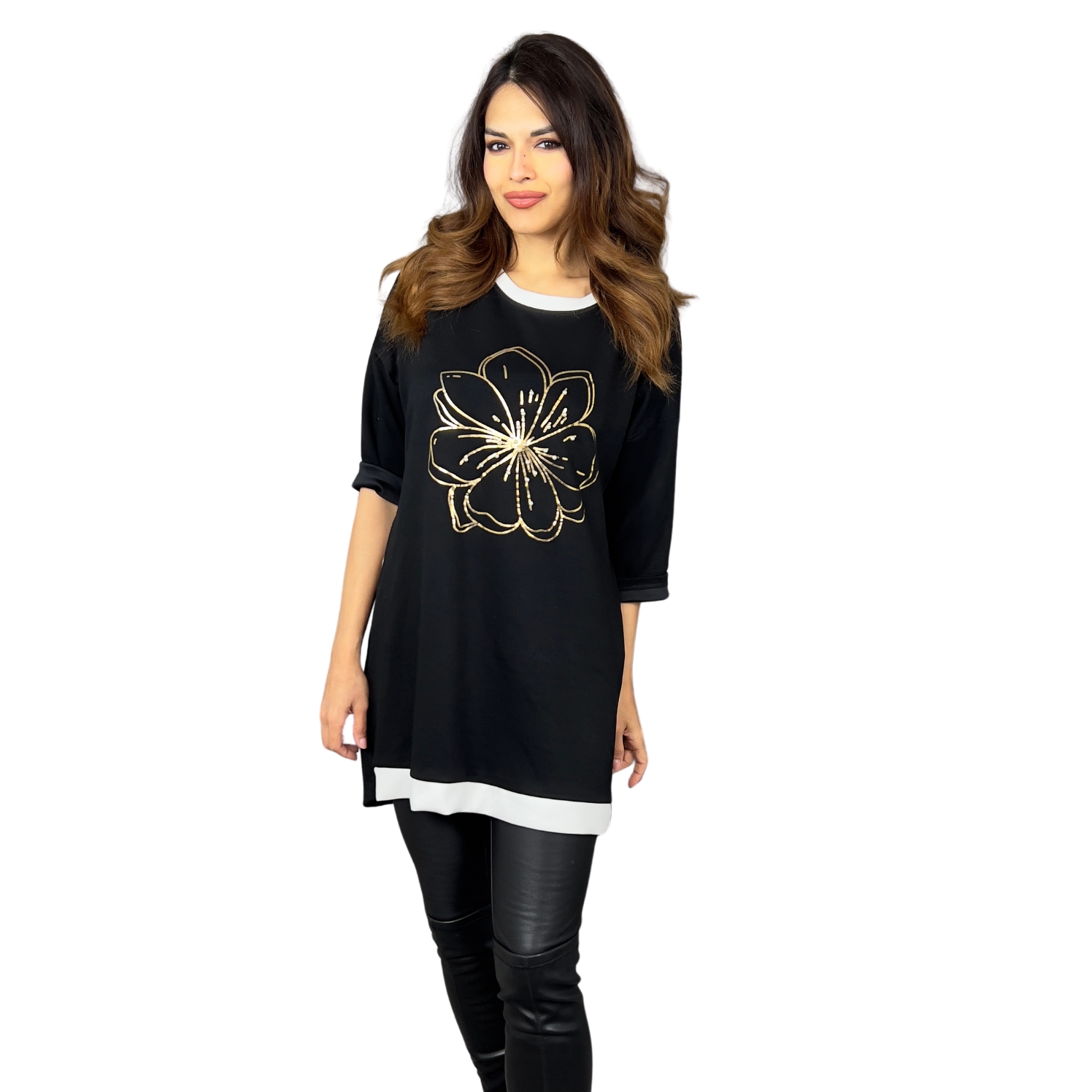 Mikinové šaty Kina jsou ideální kombinací ležérního stylu a elegance. Volný střih poskytuje maximální pohodlí, zatímco stylový květinový potisk se zlatými detaily dodává sofistikovaný vzhled. Kontrastní lemy u výstřihu a na spodním okraji šatů vytvářejí moderní efekt, který zaujme na první pohled. Tříčtvrteční rukávy lze pohodlně ohrnout, což dodává šatům variabilitu.