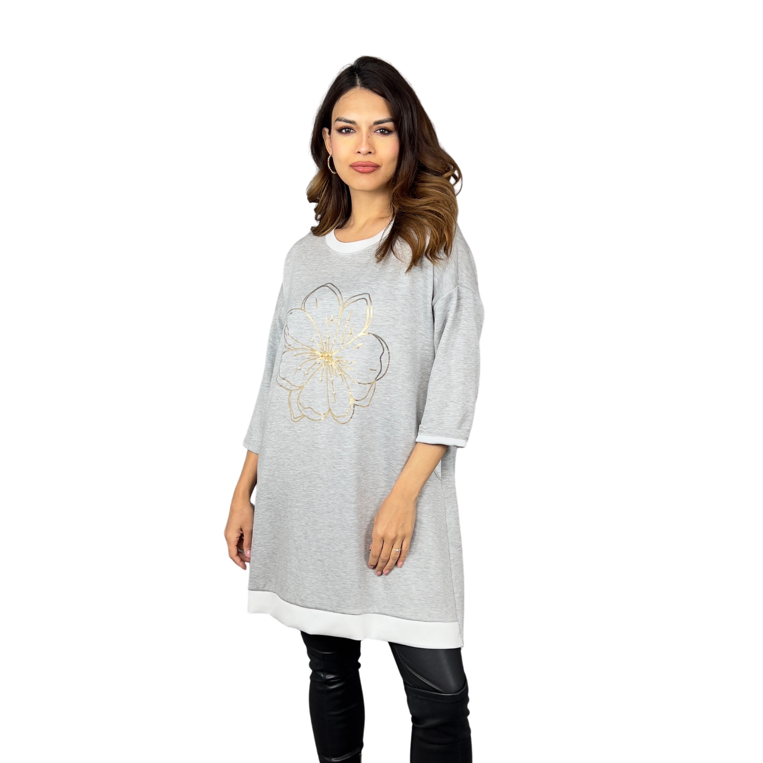 Mikinové šaty Kina jsou ideální kombinací ležérního stylu a elegance. Volný střih poskytuje maximální pohodlí, zatímco stylový květinový potisk se zlatými detaily dodává sofistikovaný vzhled. Kontrastní lemy u výstřihu a na spodním okraji šatů vytvářejí moderní efekt, který zaujme na první pohled. Tříčtvrteční rukávy lze pohodlně ohrnout, což dodává šatům variabilitu.