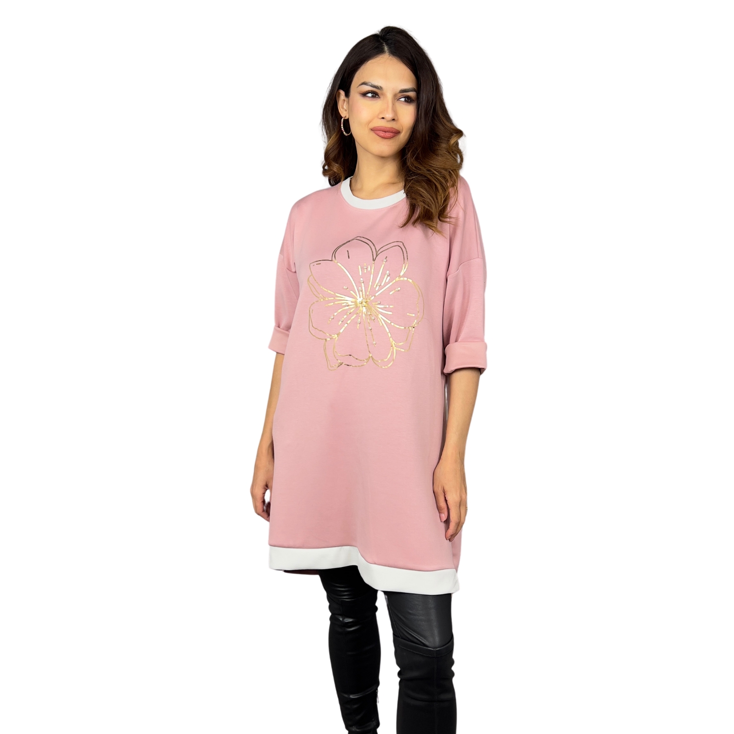 Mikinové šaty Kina jsou ideální kombinací ležérního stylu a elegance. Volný střih poskytuje maximální pohodlí, zatímco stylový květinový potisk se zlatými detaily dodává sofistikovaný vzhled. Kontrastní lemy u výstřihu a na spodním okraji šatů vytvářejí moderní efekt, který zaujme na první pohled. Tříčtvrteční rukávy lze pohodlně ohrnout, což dodává šatům variabilitu.