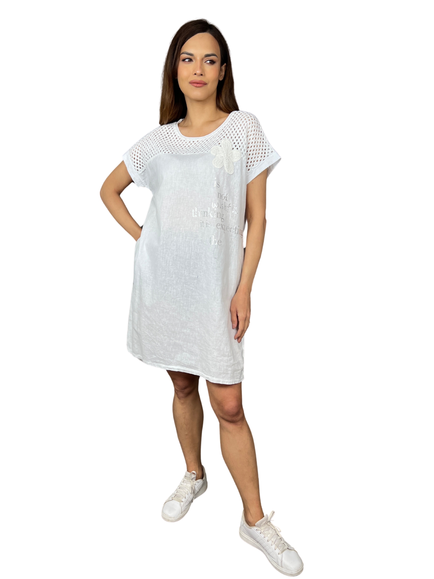Dominantním prvkem šatů je háčkovaná vrchní část s kulatým výstřihem, která decentně kontrastuje s hladkou spodní částí. Na hrudi je umístěn nápis s efektním stříbrným potiskem a výrazná květinová aplikace ve stejné barvě jako šaty. Volnější střih poskytuje naprostou volnost pohybu a přirozeně padne každé postavě.