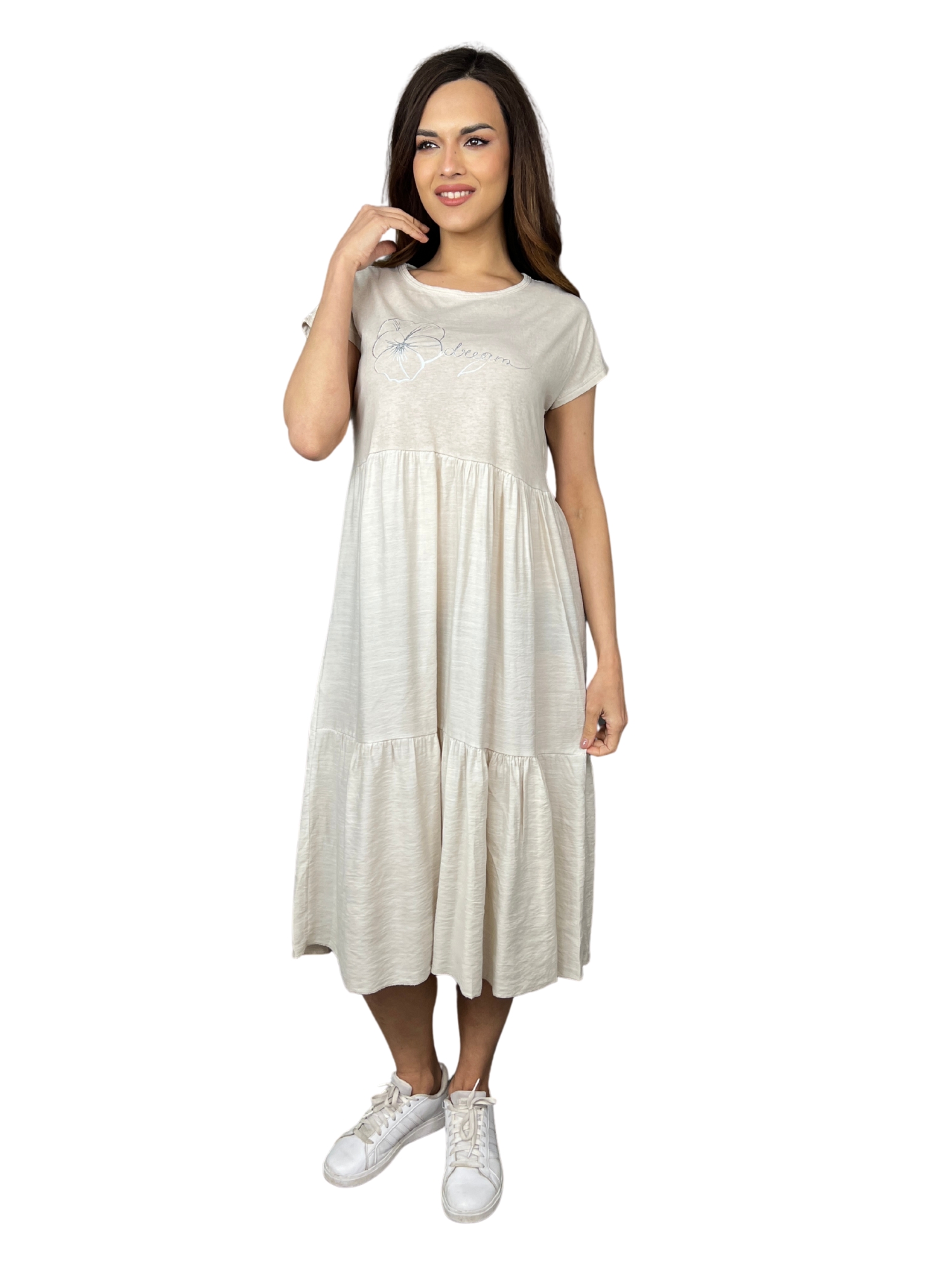 Přední díl zdobí jemný potisk květiny s nápisem dream, který jim dodává moderní a hravý nádech. Krátké rukávy a kulatý výstřih podtrhují ležérní charakter tohoto pohodlného modelu. Délka ke kolenům či mírně pod ně je univerzálně nositelná a vhodná pro každodenní styling.