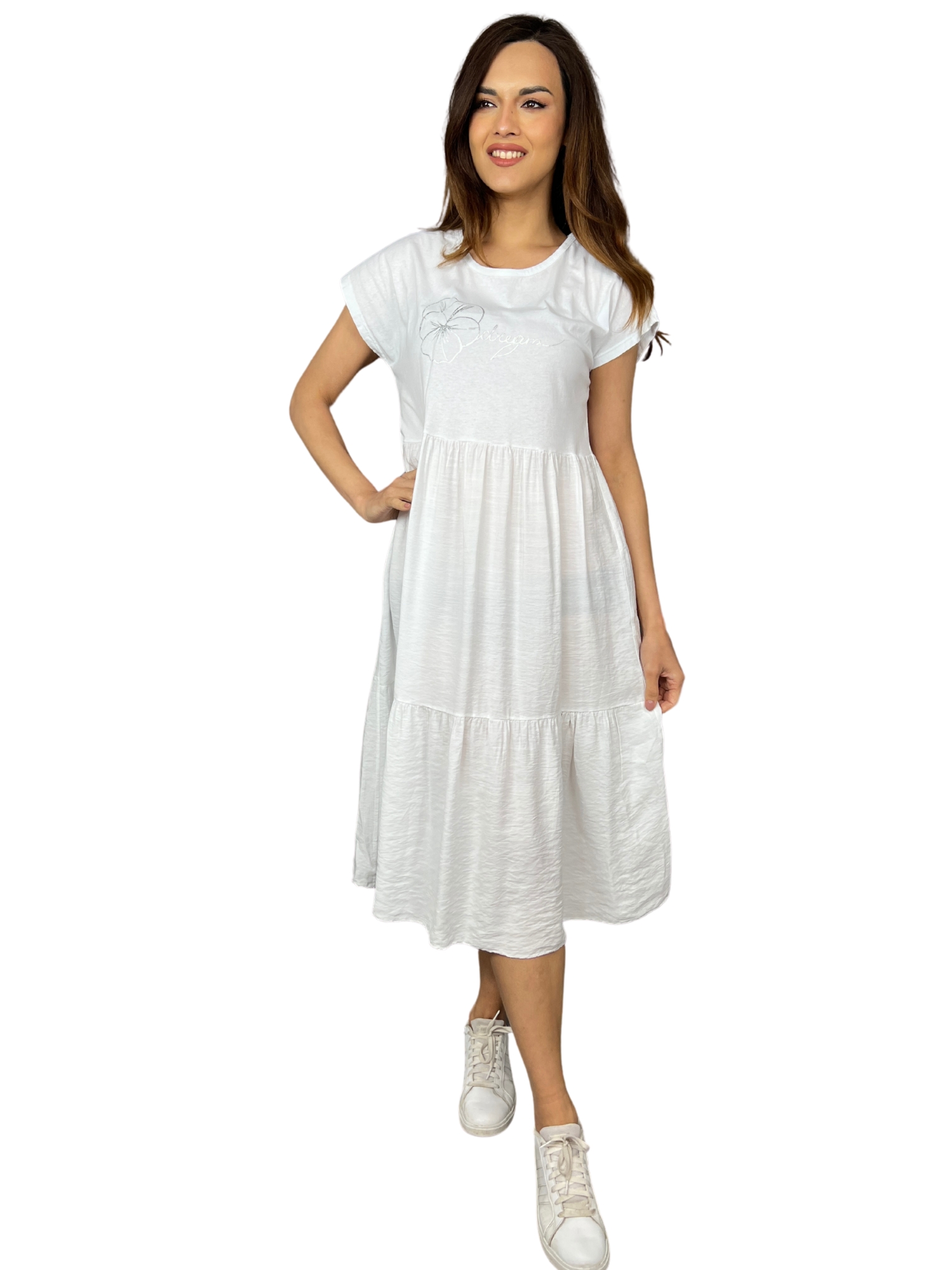 Přední díl zdobí jemný potisk květiny s nápisem dream, který jim dodává moderní a hravý nádech. Krátké rukávy a kulatý výstřih podtrhují ležérní charakter tohoto pohodlného modelu. Délka ke kolenům či mírně pod ně je univerzálně nositelná a vhodná pro každodenní styling.