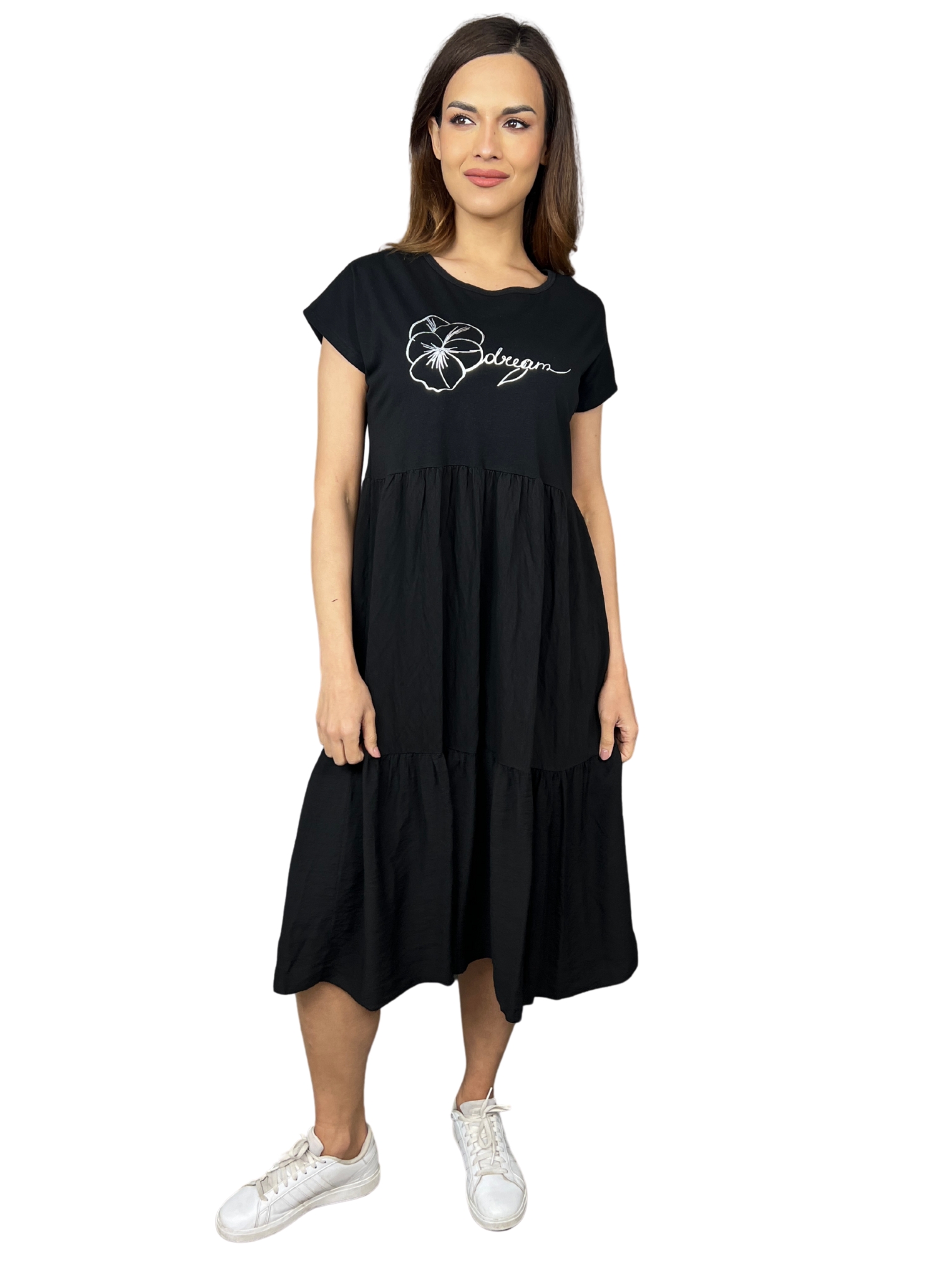 Přední díl zdobí jemný potisk květiny s nápisem dream, který jim dodává moderní a hravý nádech. Krátké rukávy a kulatý výstřih podtrhují ležérní charakter tohoto pohodlného modelu. Délka ke kolenům či mírně pod ně je univerzálně nositelná a vhodná pro každodenní styling.