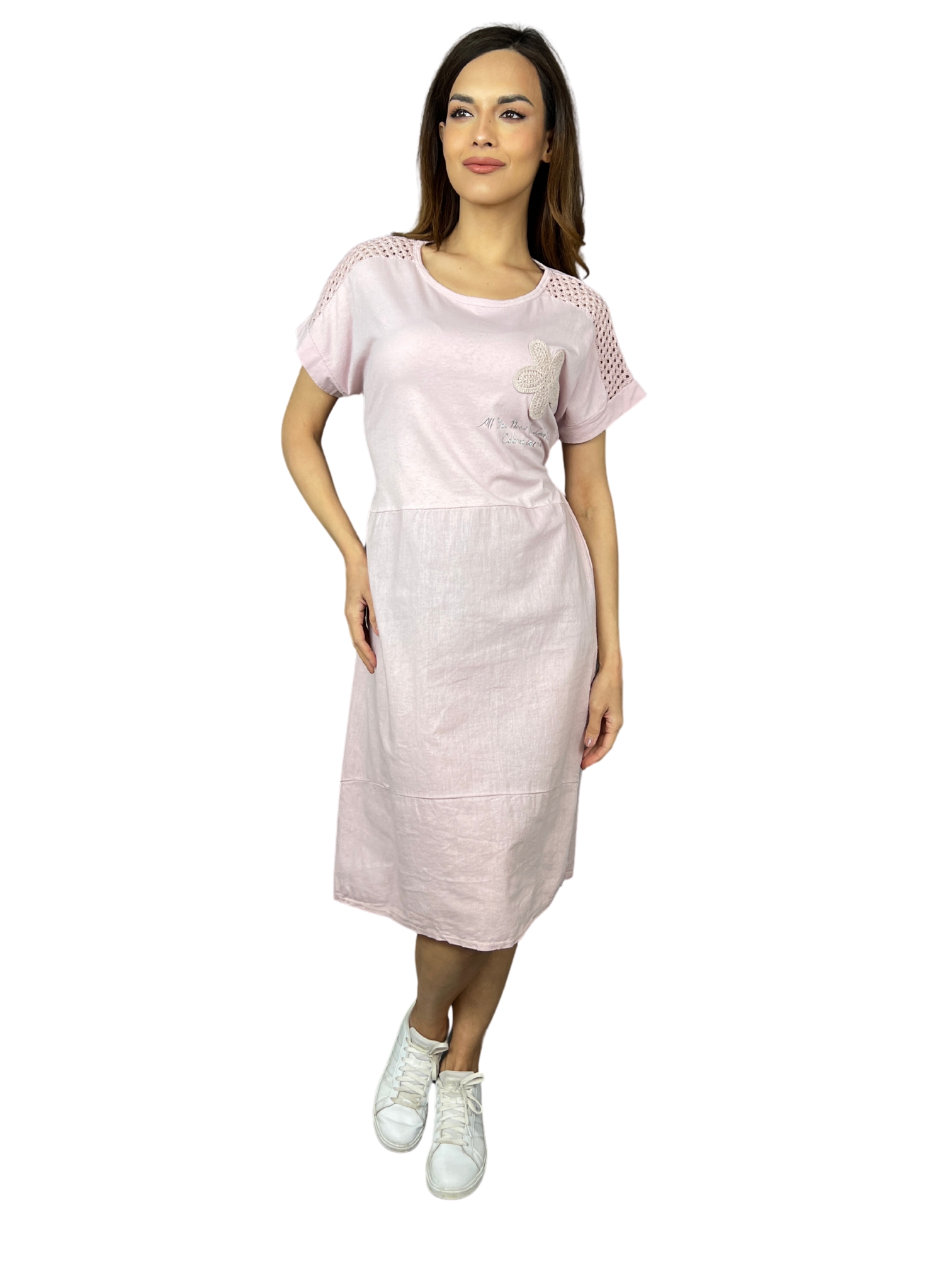 Šaty mají krátké rukávy s ohrnutým zakončením, kulatý výstřih a jemnou ozdobu v podobě květinové aplikace na hrudi. Prodyšné háčkované detaily na ramenou dodávají modelu nádech ženskosti a originality. Praktický volnější střih zajišťuje pohodlí, zatímco decentní barevná paleta z nich činí skvělý univerzální kousek do vašeho šatníku.