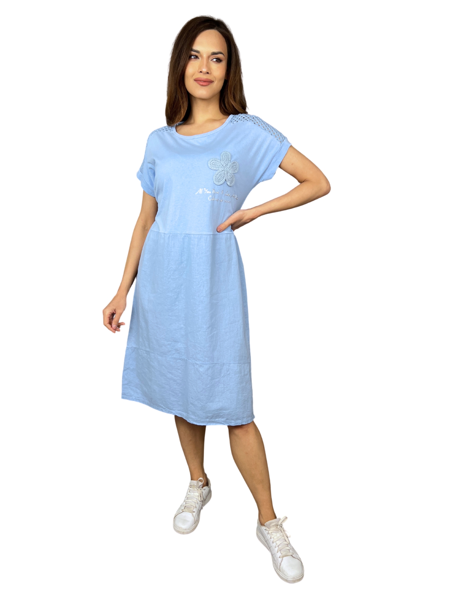 Šaty mají krátké rukávy s ohrnutým zakončením, kulatý výstřih a jemnou ozdobu v podobě květinové aplikace na hrudi. Prodyšné háčkované detaily na ramenou dodávají modelu nádech ženskosti a originality. Praktický volnější střih zajišťuje pohodlí, zatímco decentní barevná paleta z nich činí skvělý univerzální kousek do vašeho šatníku.