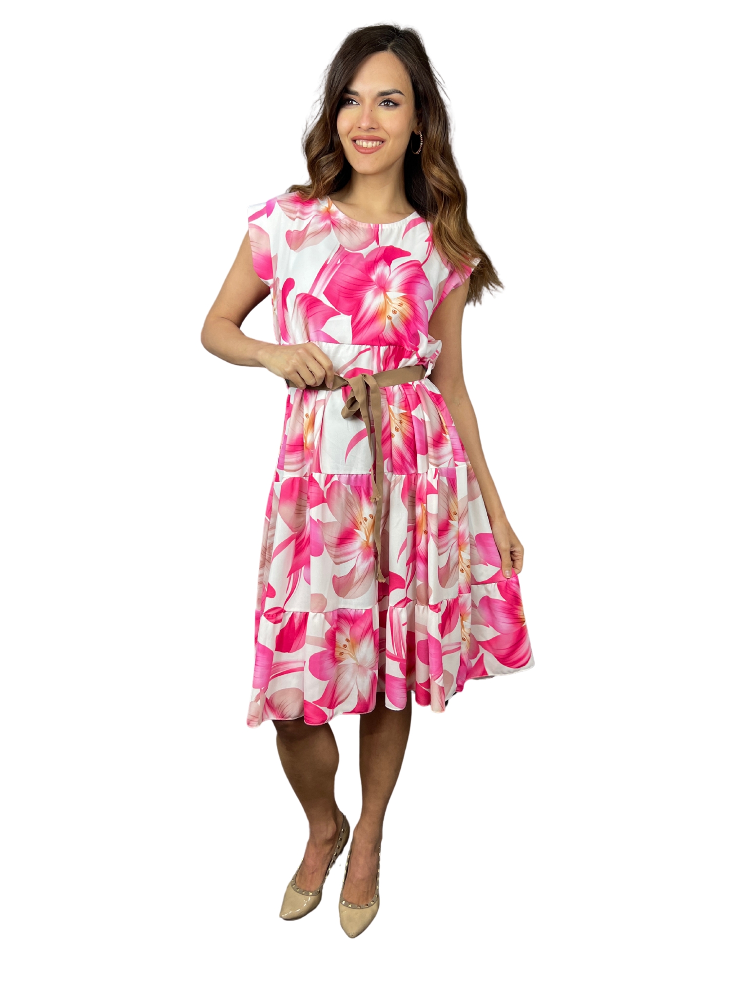 Šaty mají kulatý výstřih a krátké spadlé rukávy, které působí nenuceně a elegantně. Nařasený pas se zavazovací stuhou v béžovém tónu umožňuje přizpůsobení střihu, zatímco sukně s volánovým lemem dodává šatům pohyb a lehkost. Květinový potisk ve variantách modré, béžové, zelené, růžové nebo černé dodává každému modelu jedinečný charakter.