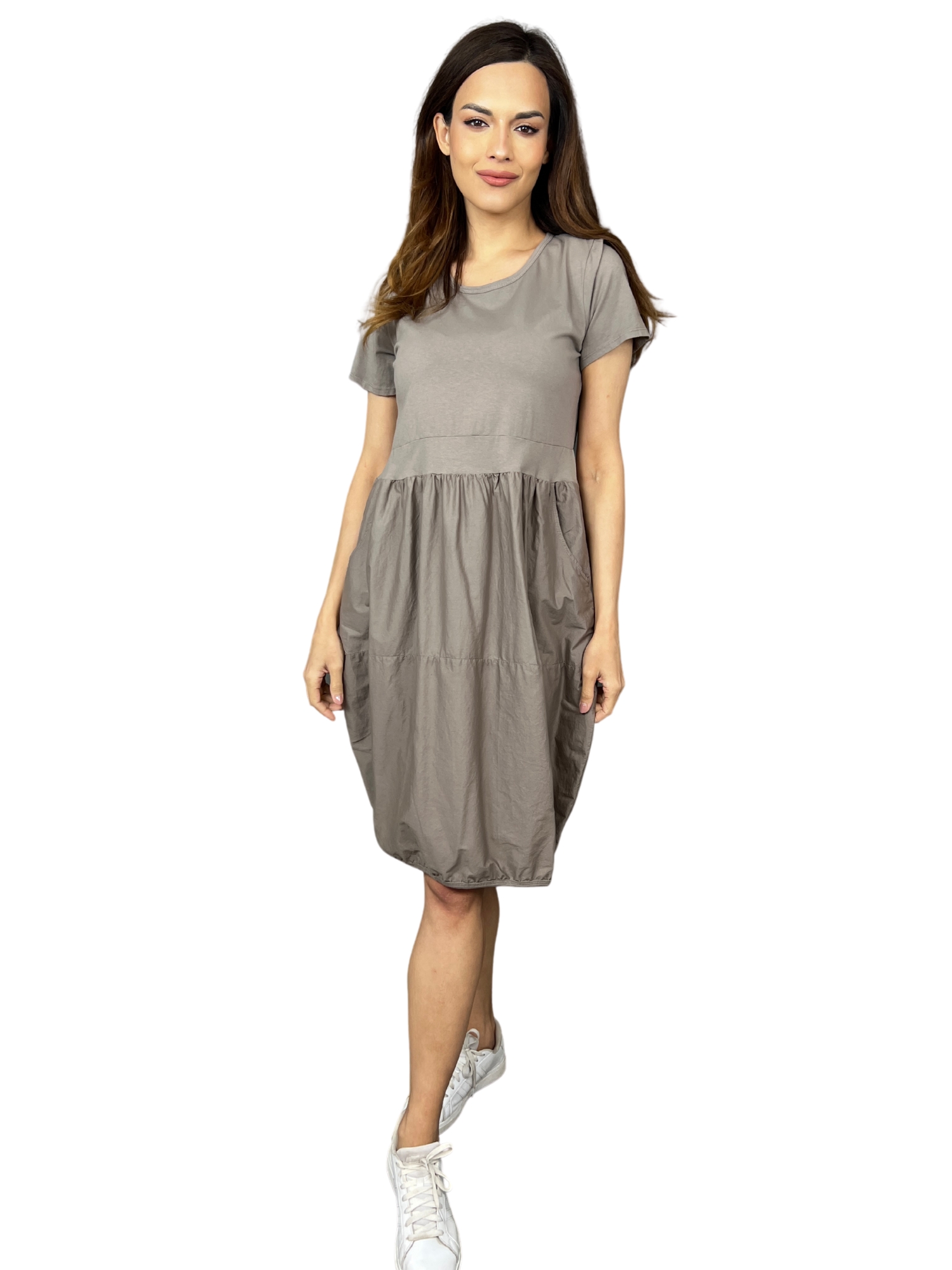 Horní část je z příjemného úpletu, zatímco spodní sukně je z lehce strukturovaného materiálu, díky kterému šaty drží moderní nabíraný tvar. Výrazným prvkem jsou praktické kapsy a mírně elastické zakončení spodního lemu, které vytváří efektní zaoblení. Kulatý výstřih a krátké rukávy dodávají modelu jednoduchý a elegantní výraz.