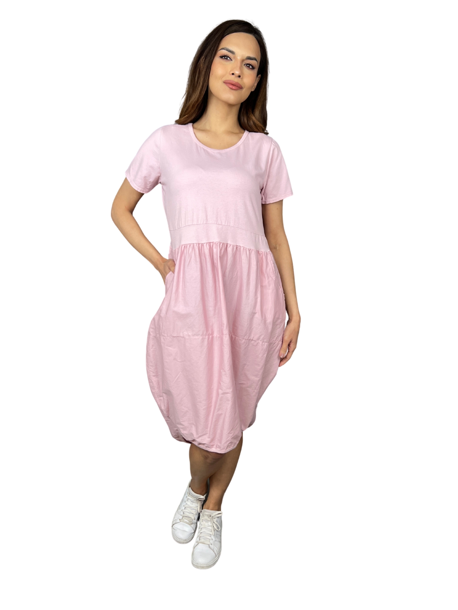 Horní část je z příjemného úpletu, zatímco spodní sukně je z lehce strukturovaného materiálu, díky kterému šaty drží moderní nabíraný tvar. Výrazným prvkem jsou praktické kapsy a mírně elastické zakončení spodního lemu, které vytváří efektní zaoblení. Kulatý výstřih a krátké rukávy dodávají modelu jednoduchý a elegantní výraz.