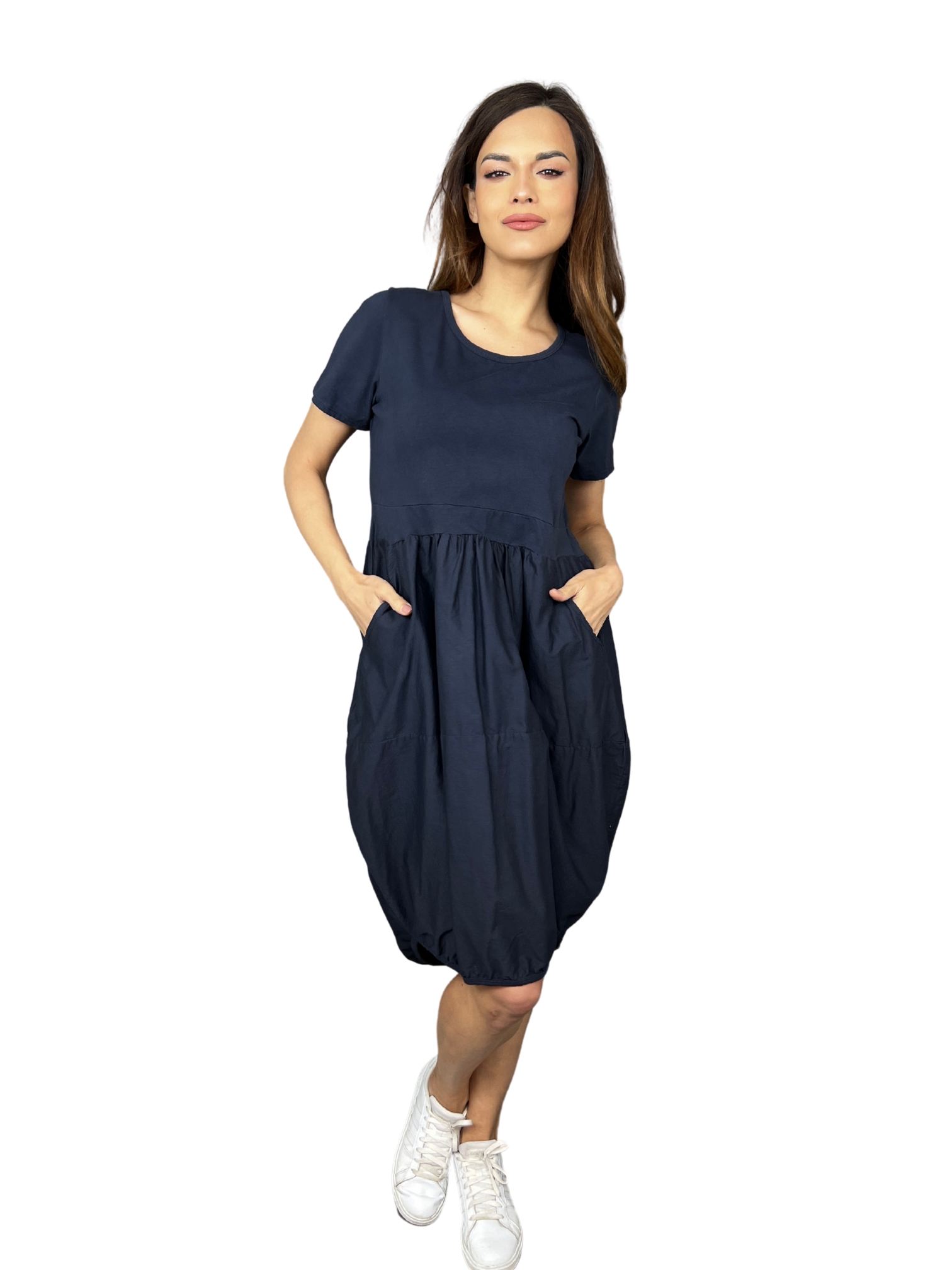 Horní část je z příjemného úpletu, zatímco spodní sukně je z lehce strukturovaného materiálu, díky kterému šaty drží moderní nabíraný tvar. Výrazným prvkem jsou praktické kapsy a mírně elastické zakončení spodního lemu, které vytváří efektní zaoblení. Kulatý výstřih a krátké rukávy dodávají modelu jednoduchý a elegantní výraz.