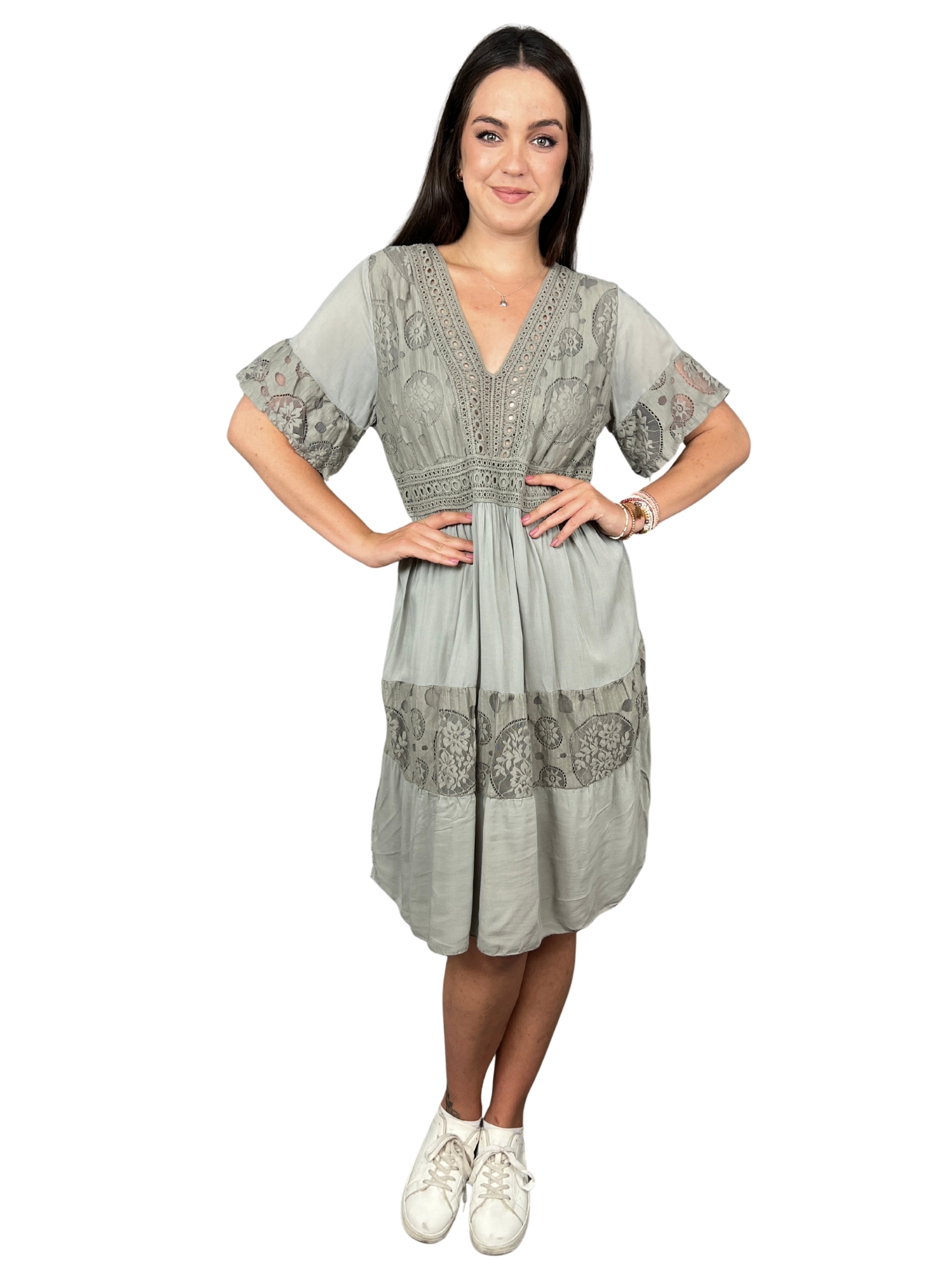 Šaty Marilou jsou ztělesněním ženskosti, lehkosti a pohodlí. Díky bohaté krajkové výšivce, jemnému výstřihu do V a volánovým rukávům jsou ideální volbou pro každodenní nošení i letní příležitosti.