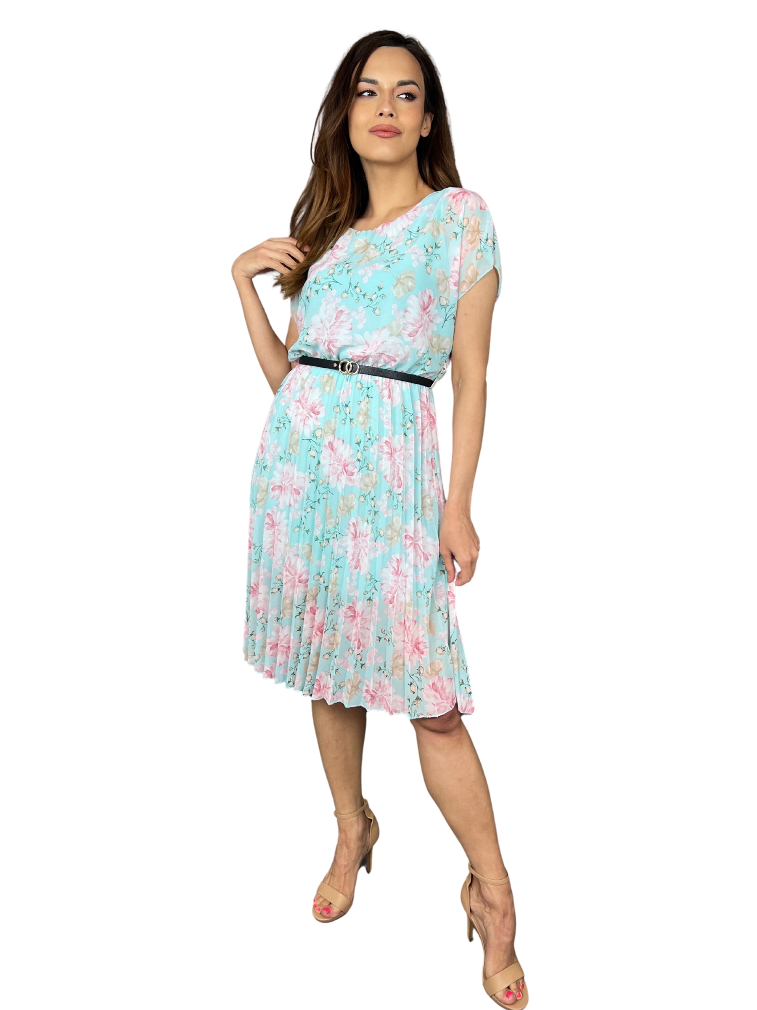 Horní část šatů je volná, s krátkými rukávy a kulatým výstřihem, což zajišťuje maximální komfort i při celodenním nošení. Spodní část je elegantně plisé – skládaná sukně dodává šatům lehkost při každém kroku a přirozeně se vlní kolem těla. Šaty se oblékají přes hlavu a pásek je součástí modelu, snadno nastavitelný dle potřeby.