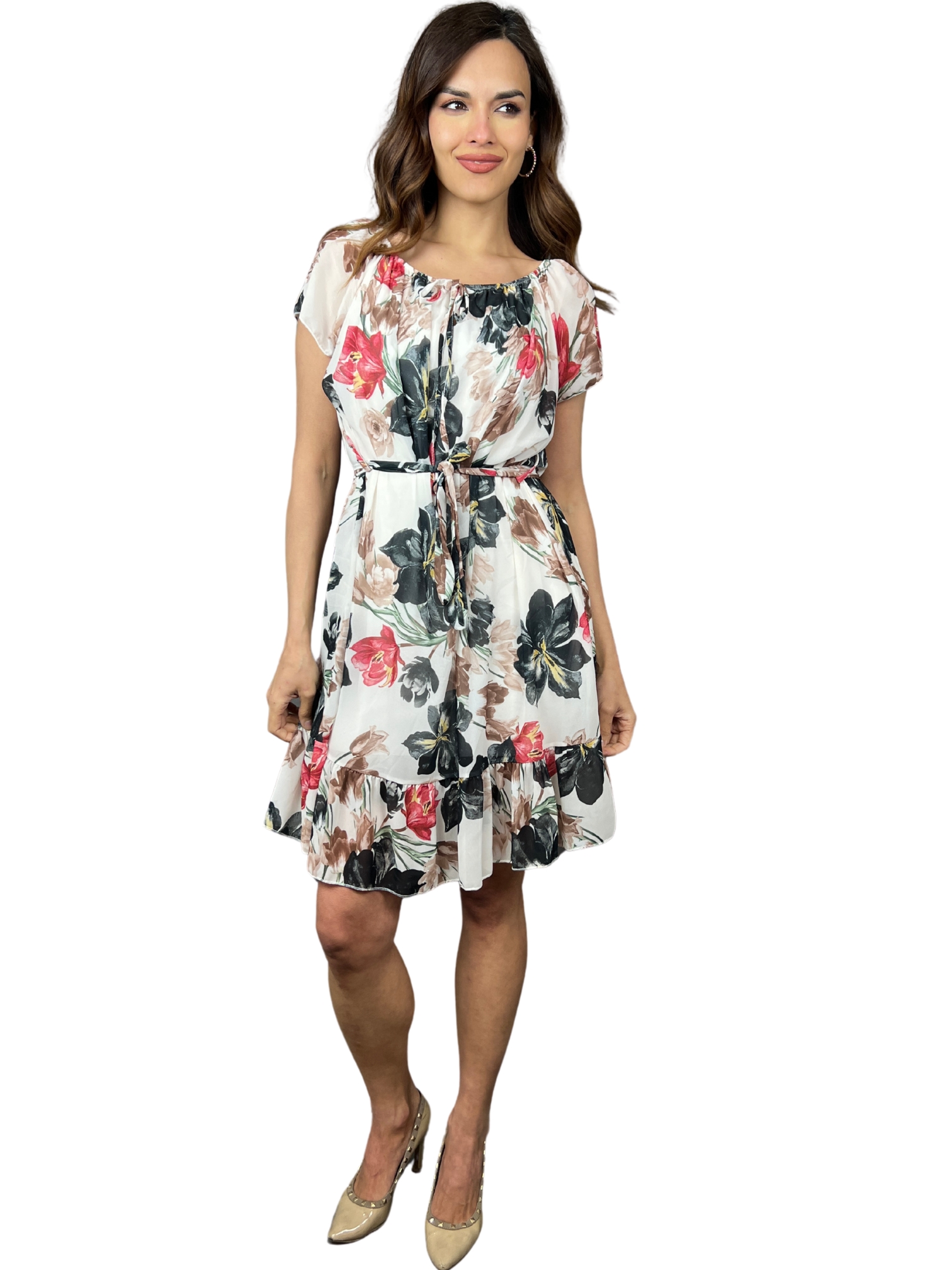 Šaty mají krátké rukávy a jemně nabíraný výstřih, který se přizpůsobí podle potřeby. V pase je látkový pásek pro úpravu siluety a spodní lem zdobí decentní volán, který šatům dodává lehkost a hravost. Květinový motiv v kombinaci s jemným podkladem přináší harmonii i šmrnc v každém barevném provedení – od jemné růžové až po elegantní černou.