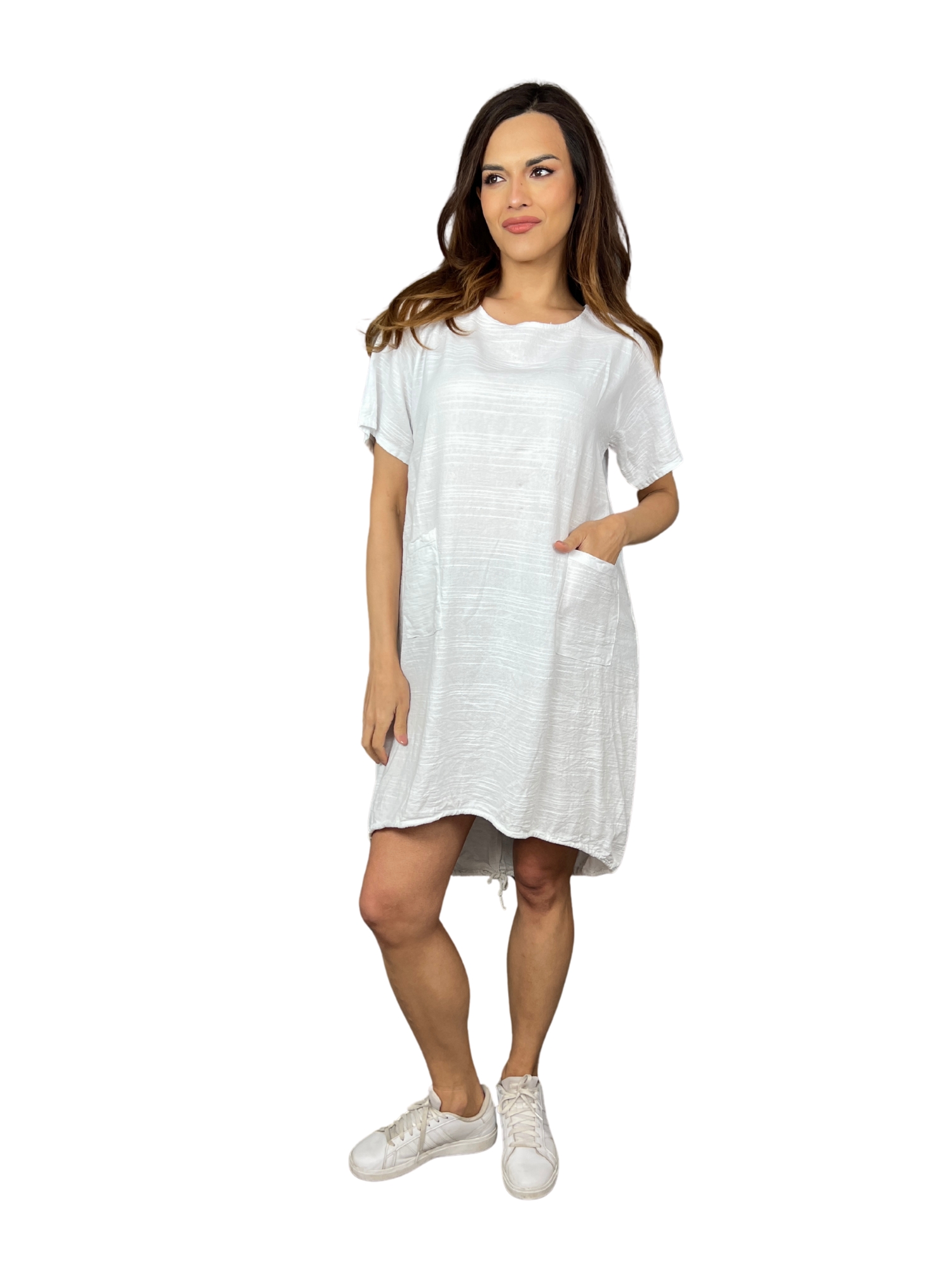 Šaty Rima jsou perfektní volbou pro každodenní nošení i volný čas. Jejich volnější střih zajišťuje volnost pohybu, zatímco přírodní bavlněný materiál vás udrží svěží i v těch nejteplejších dnech. Šaty mají měkce spadlý rukáv a praktické kapsy na bocích, které zvyšují jejich funkčnost i styl.