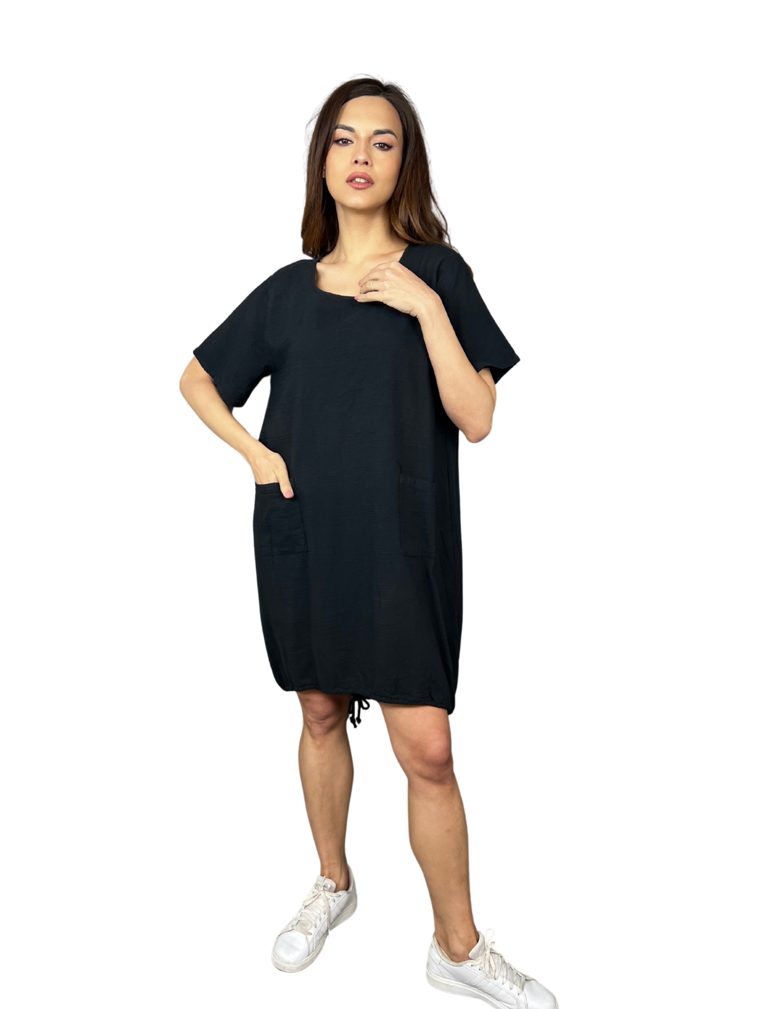 Díky jednoduchému kulatému výstřihu a minimalistickému designu jsou univerzálním kouskem, který snadno sladíte se sportovními teniskami, sandály i balerínami. Spodní lem je zakončen tunýlkem s možností stažení na šňůrku – díky tomu si můžete upravit délku a styl podle nálady.