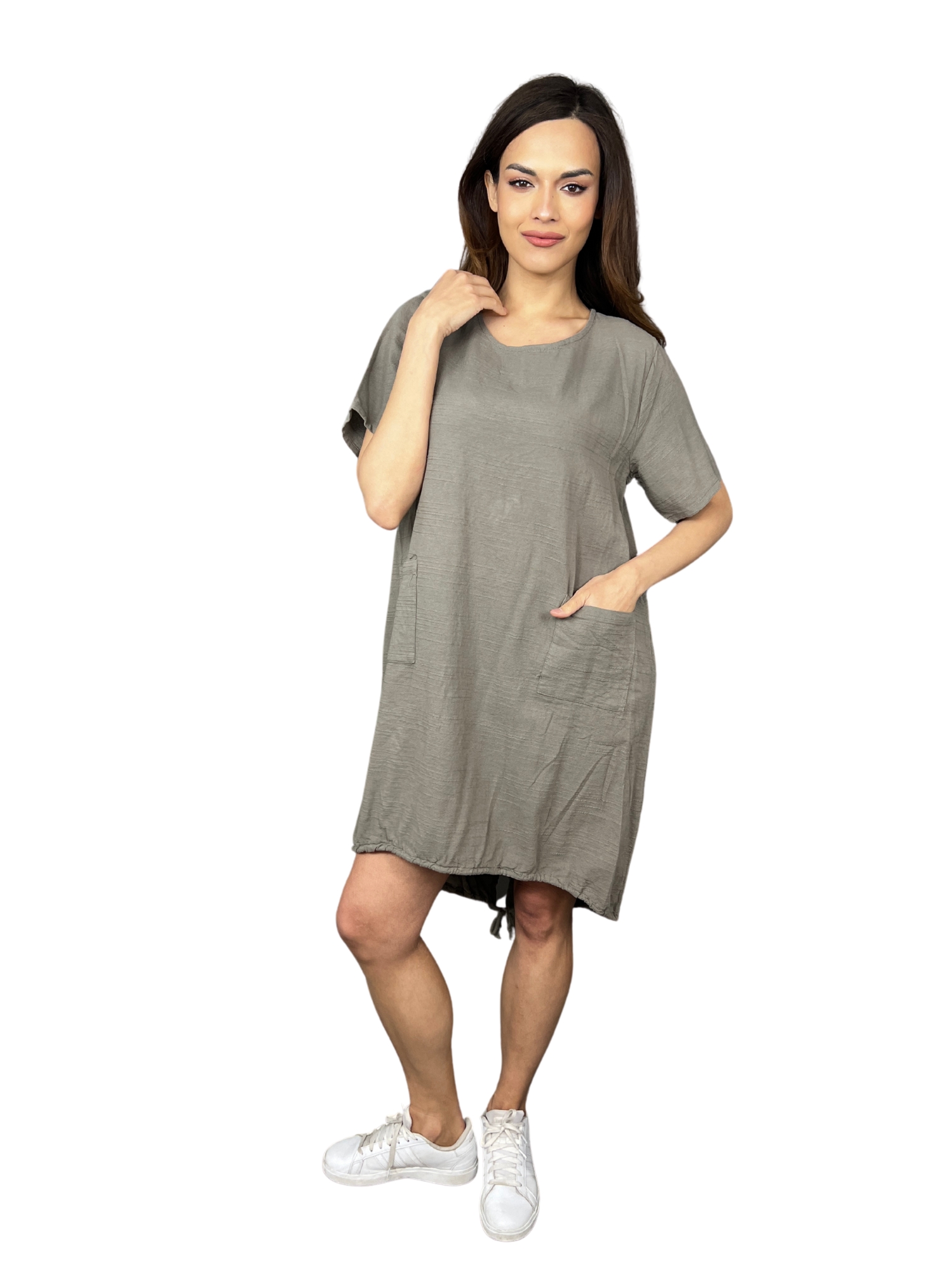 Šaty Rima jsou perfektní volbou pro každodenní nošení i volný čas. Jejich volnější střih zajišťuje volnost pohybu, zatímco přírodní bavlněný materiál vás udrží svěží i v těch nejteplejších dnech. Šaty mají měkce spadlý rukáv a praktické kapsy na bocích, které zvyšují jejich funkčnost i styl.