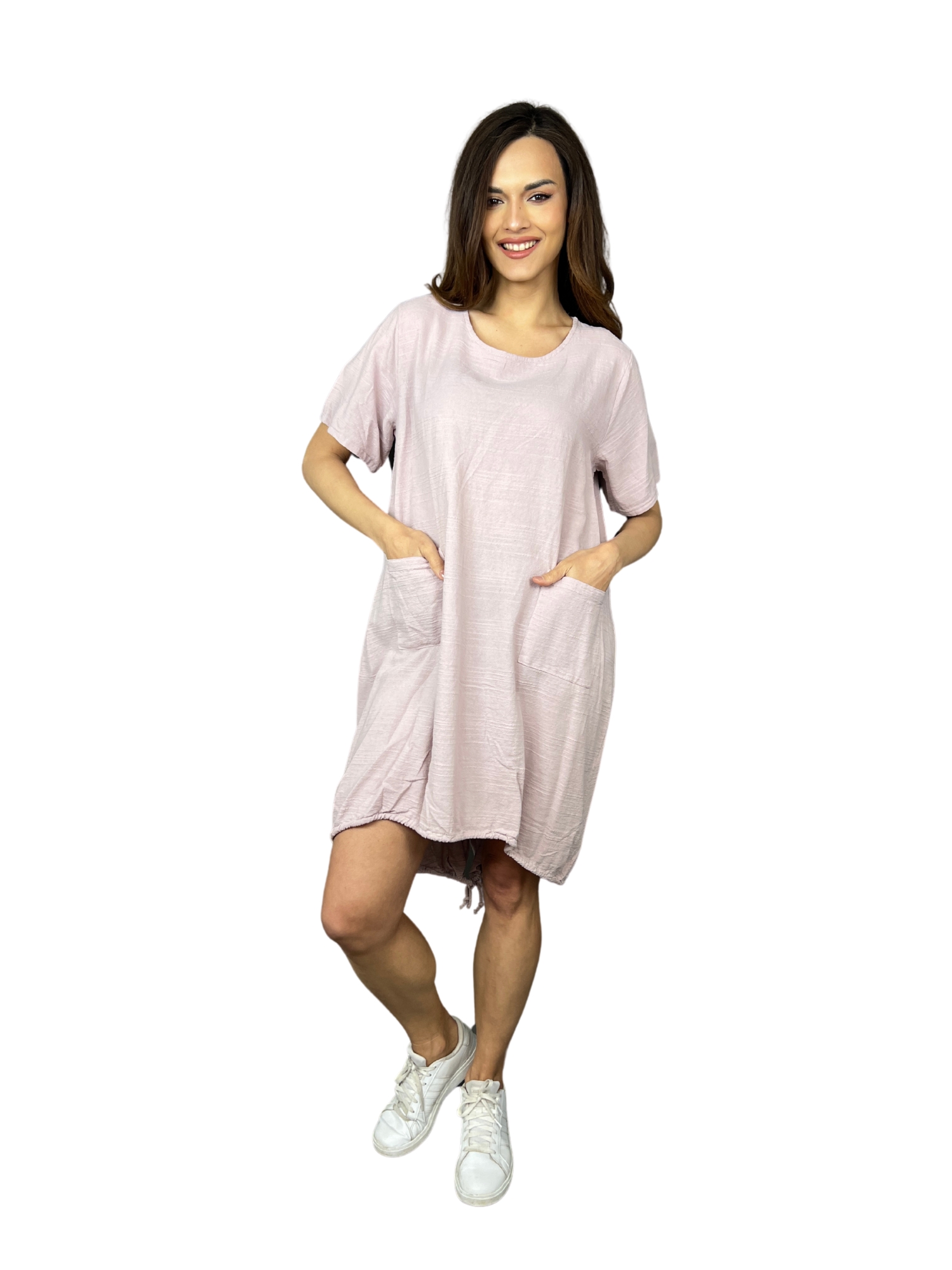Šaty Rima jsou perfektní volbou pro každodenní nošení i volný čas. Jejich volnější střih zajišťuje volnost pohybu, zatímco přírodní bavlněný materiál vás udrží svěží i v těch nejteplejších dnech. Šaty mají měkce spadlý rukáv a praktické kapsy na bocích, které zvyšují jejich funkčnost i styl.
