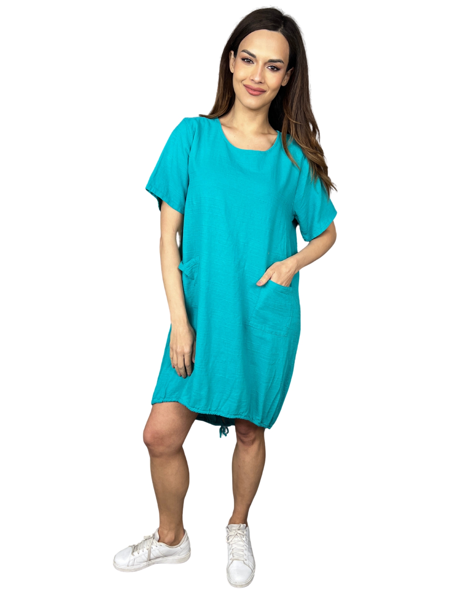 Šaty Rima jsou perfektní volbou pro každodenní nošení i volný čas. Jejich volnější střih zajišťuje volnost pohybu, zatímco přírodní bavlněný materiál vás udrží svěží i v těch nejteplejších dnech. Šaty mají měkce spadlý rukáv a praktické kapsy na bocích, které zvyšují jejich funkčnost i styl.