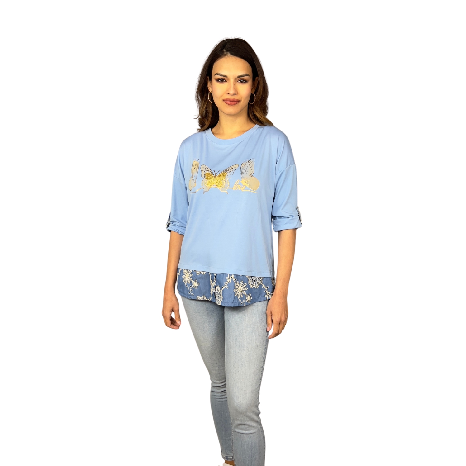 Top Sirin je dokonalým spojením pohodlí a stylu. Lehký, volnější střih s originálním vrstveným efektem vytváří dojem dvou kusů v jednom, což dodává outfitu moderní a ležérní vzhled. Přední strana je ozdobena jemným potiskem motýlů s třpytivými detaily, který dodává ženskost a hravost. Díky ohrnovacím rukávům a spodnímu lemu s košilovým efektem působí top originálně a univerzálně.