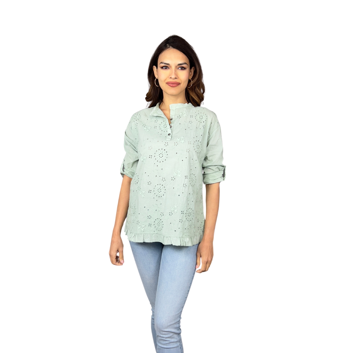 Tento top má volnější střih, který lichotí každé postavě, a zapínání na knoflíčky u krku, což dodává ležérní, ale zároveň elegantní vzhled. Rukávy lze snadno ohrnout a přizpůsobit dle potřeby. Jemné perforace a výšivky po celém povrchu tvoří jedinečný vzor, který dodává topu nadčasový šarm.