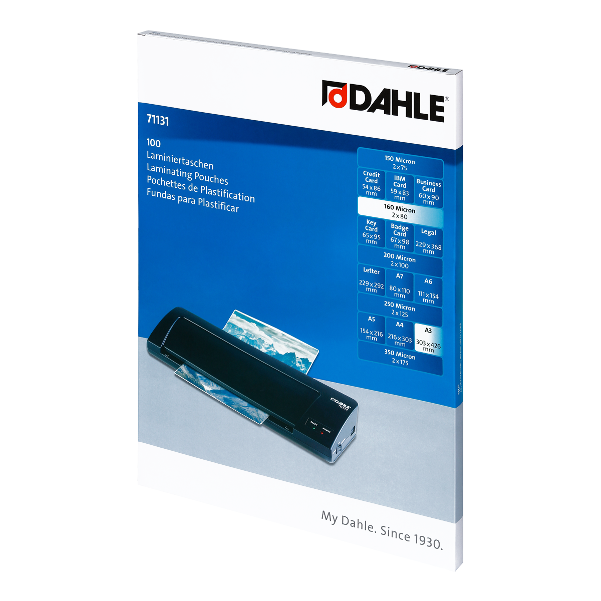 Laminovací kapsa určená pro DAHLE a jiné laminátory. Oboustranně těsnící ochrana proti větru a vlhku, nečistotám nebo poškození. Tenčí síla folie umožňuje přesné uchování barev na fotografiích nebo jiných dokumentech. Přístup ze tří stran, vkládání do laminátoru uzavřenou stranou. Výsledkem je hladký povrch bez vadných záhybů a bublin.pro formát: A3síla fólie: 2× 80 µm, lesklá úpravatrvalá ochrana, vysoká odolnostvhodné pro fotografiekompatibilní s laminátory jiných značekobsah balení: 100 ks
