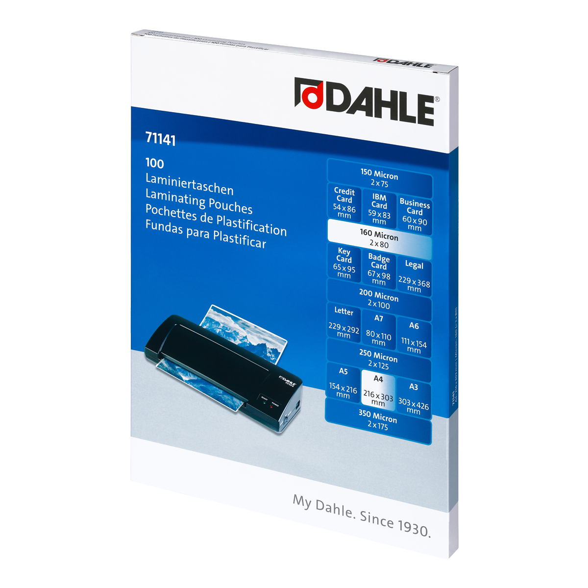 Laminovací kapsa určená pro DAHLE a jiné laminátory. Oboustranně těsnící ochrana proti větru a vlhku, nečistotám nebo poškození. Tenčí síla folie umožňuje přesné uchování barev na fotografiích nebo jiných dokumentech. Přístup ze tří stran, vkládání do laminátoru uzavřenou stranou. Výsledkem je hladký povrch bez vadných záhybů a bublin.pro formát: A4síla fólie: 2× 80 µm, lesklá úpravatrvalá ochrana, vysoká odolnostvhodné pro fotografiekompatibilní s laminátory jiných značekobsah balení: 100 ks