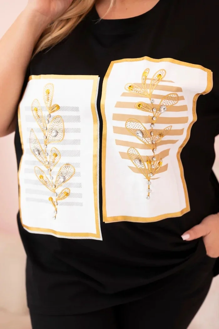 Dámská bavlněná halenka Plus Size s kamínky černá + camel UNI