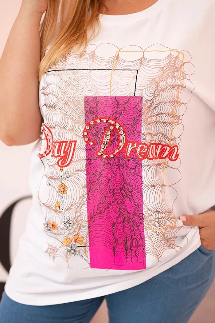 Tato dámská halenka s krátkým rukávem je ideální volbou pro ženy, které oceňují pohodlí spojené s moderním designem. Vyznačuje se originálním potiskem s nápisem „Day Dream“, který dodává stylizaci umělecký a neotřelý charakter. Oversize střih zajišťuje, že halenka krásně padne na postavu a umožňuje volnost pohybu. Díky měkké a elastické bavlně s příměsí elastanu je materiál příjemný na dotek a pohodlný na nošení po celý den. Skvělý základ pro každodenní outfity – ke džínům, legínám i sukni. Perfektní na procházky, nákupy, setkání s přáteli i volnější dny v práci. Model určený pro dámy nosící velikosti Plus Size – XXL, XXXL a větší. Modelka běžně nosí velikost 4XL/5XL. Vlastnosti produktu: Střih: oversize, volný Rukáv: krátký Materiál: elastická bavlna Pohodlí díky měkkému materiálu Potisk s nápisem „Day Dream“ s módním grafickým efektem Skvělá na každý den a ležérní příležitosti Vyrobeno v Číně Složení materiálu: 95 % bavlna, 5 % elastan Rozměry jsou měřeny naplocho +/- 1 cm Pro zjištění obvodu šířku vynásobte 2 Rozměry: Šířka v podpaží: 66 cm Celková délka: 77 cm