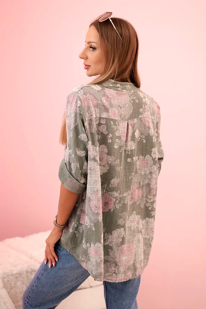 Dámská bavlněná košile s květinovým vzorem a ohrnovanými rukávy khaki UNI