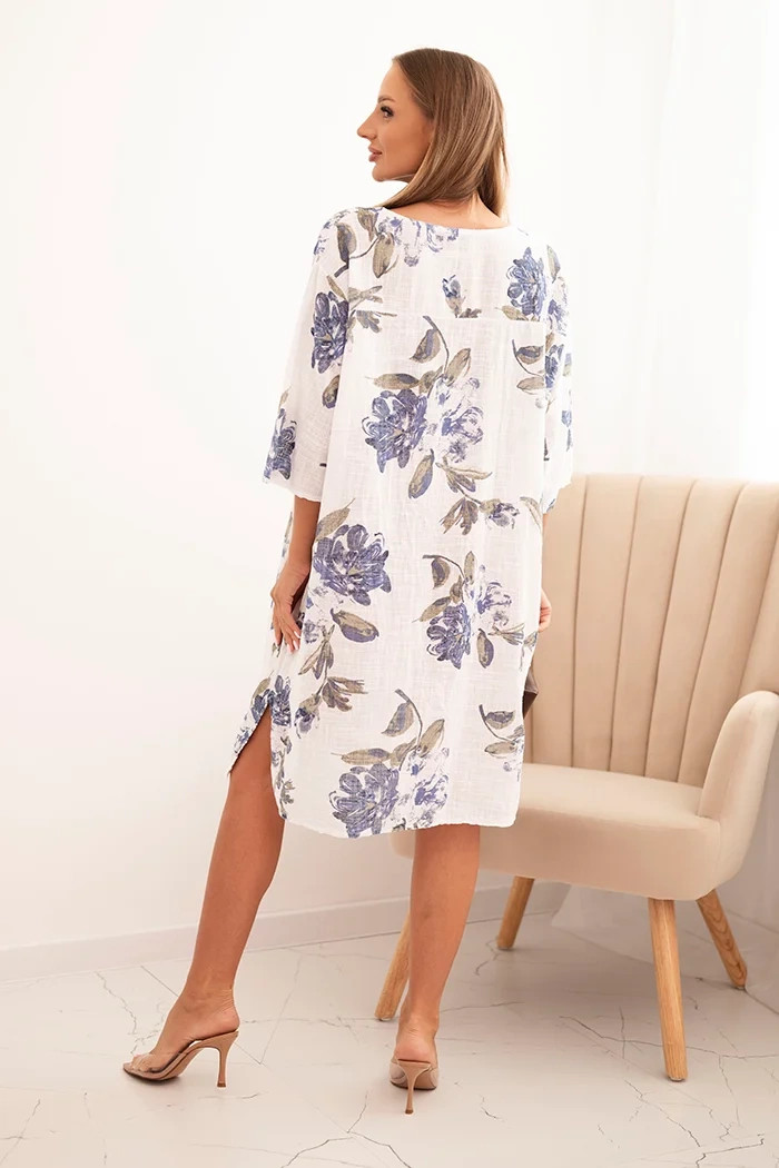 Hledáte pohodlné, lehké a ženské šaty na denní nošení? Tyto dámské šaty z příjemné bavlny jsou skvělou volbou na jaro a léto. Jemný květinový vzor a tlumená barevnost jí dodávají subtilní, přirozený charakter. Volný střih s lehce spadlým rukávem do lokte zajišťuje volnost pohybu a komfort nošení po celý den. Ideální na procházku, do práce i na setkání s přáteli. Výstřih s ozdobným knoflíkem a lehce asymetrický konec jí dodávají výjimečný půvab. Velikost je univerzální a bude vhodná pro dámy ve velikosti S, M nebo L. Vlastnosti produktu: Oversize střih s jednoduchým designem Pohodlný výstřih s knoflíkem Rukávy s možností ohrnutí Květinový potisk v přirozených barvách Lehká, prodyšná bavlna Bez zapínání – navléká se přes hlavu Výroba Italská Složení materiálu: 100% bavlna Rozměry uvedené níže jsou měřeny na plocho +/- 1 cm Pro získání rozměru obvodu šířku násobíme 2 Rozměry: Šířka pod paží: 61 cm Šířka v bocích: 65 cm Celková délka: 99 cm