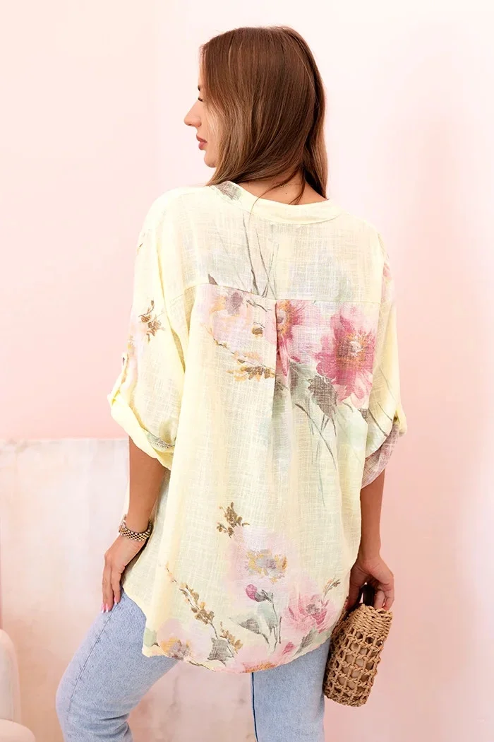 Romantická a lehká dámská halenka vyrobená ze 100% přírodní bavlny, která zajišťuje výjimečné pohodlí a prodyšnost i během teplých dnů. Model je ozdoben velkým květinovým vzorem a jemným leskem drobných flitrů na kapsičce. Střih s výstřihem do V a částečným zapínáním na knoflíky zdůrazňuje ženský styl, zatímco zaoblená zadní část a rukávy s možností ohrnutí dodávají ležérní charakter. Skvělý tip ke džínům, plátěným kalhotám nebo lehké sukni. Velikost je univerzální a bude vhodná pro ženy nosící velikost L, XL nebo XXL. Vlastnosti produktu: Vyrobená ze 100% přírodní bavlny Lehký, prodyšný materiál – ideální na léto Výstřih do V s knoflíky Kapsička s jemnými flitry Rukávy s možností ohrnutí Delší zadní část – volný a pohodlný střih Vyrobeno v Itálii Složení materiálu: 100% Bavlna Rozměry: Rozměry uvedené níže jsou měřeny naplocho +/- 1 cm Pro výpočet obvodu vynásobte šířku × 2 Šířka v podpaží: 61 cm Celková délka přední části: 68 cm / zadní: 75 cm Délka rukávu od podpaží: 30 cm