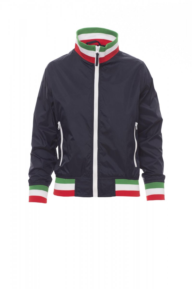Dámská ergonomická lehká bunda s bílým plastovým zipem s kovovým jezdcem, žebrovaný límec, manžety a pas s kontrastním lemem v barvách italské vlajky, dvě vnější kapsy, bez zateplení, zátěr dry-tech, vnitřní kapsa a zip pro snadnější potisk a vyšívání.