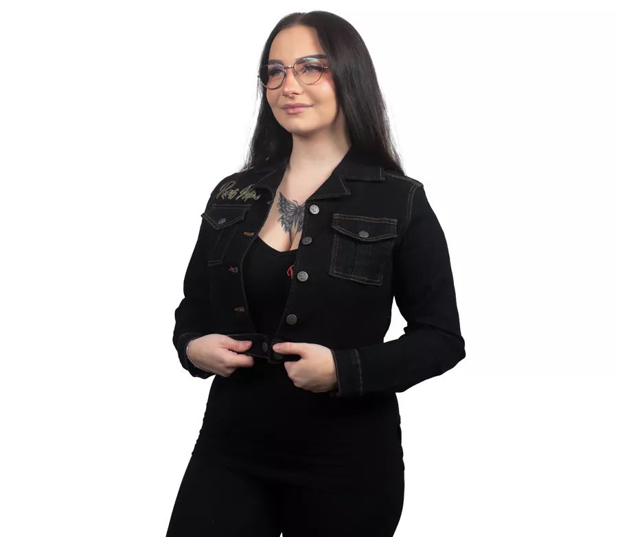 - dámská riflová bundička do pasu \r - černá barva se stylovým hnědým šitím\r - 80% bavlna, 18% polyester, 2% spandex \r - příjemná látka za krkem \r - výšivka Rusty Pistons na pravé straně hrudníku \r - 2 malé kapsičky na patent na hrudi \r - zapínání na knoflíky \r - malá kožená RP patch na spodním lemu \r - stahování v pase na knoflíky \r - Rusty Pistons Chick Rulez výšivka na zádech \r - náhradní knoflík přiložen\r - ideální v kombinaci s Rusty Pistons šaty či kalhoty s vyšším pasem