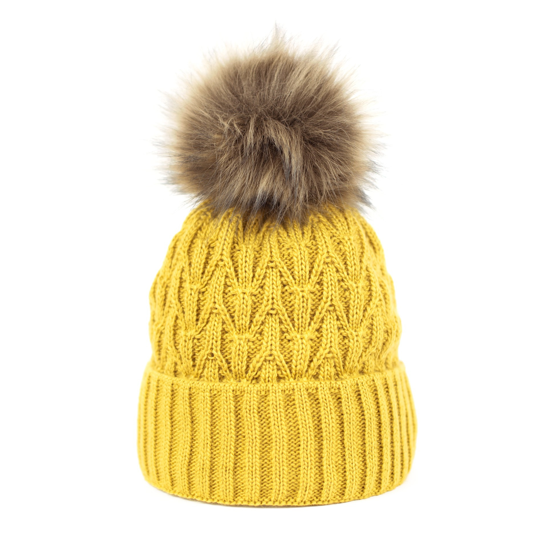 Zimní čepice s bambulí. Provedená z dvojitého materiálu. Bambule provedená z umělé kožešiny. Lehce elastická. Vejdou se do ní sepnuté vlasy. Hodí se ke každodenním stylizacím. Materiál složení: 85% akryl 15% polyamid Barva: žlutá Kolekce: podzim/zima Pohlaví: ženské