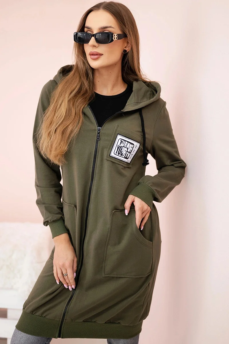 Tato delší dámská mikina s kapucí je ideální volbou na chladnější dny – spojuje pohodlí, funkčnost a módní městský styl. Je ušitá z měkké bavlny s přídavkem elastanu, což zajišťuje pohodlí při nošení a volnost pohybu po celý den. Mikina se zapíná na praktický zip a kapuce se šňůrkami jí dodává ležérní charakter. Velké našité kapsy vpředu jsou nejen stylové, ale také velmi funkční. Široké lemy na spodním okraji a na rukávech zajišťují, že mikina dobře sedí a chrání před chladem. Velikost je univerzální a bude vhodná pro ženy velikosti S, M nebo L. Vlastnosti produktu: Střih: delší mikina s kapucí Materiál: měkký, elastický úplet Pohodlné nošení díky volnému střihu Funkční zip po celé délce Boční kapsy a ozdobná nášivka na hrudi Manžety dole a na rukávech Styl: casual, streetwear, ideální pro každodenní nošení Turecká výroba Složení materiálu: 90 % Bavlna, 10 % Elastan Rozměry uvedené níže jsou měřeny naplocho +/- 1 cm Pro získání obvodu šířku vynásobíme 2 Rozměry: Šířka pod pažemi: 52 cm Celková délka: 93 cm Délka rukávu od ramene: 59 cm Délka rukávu od podpaží: 45 cm Šířka v bocích: 55 cm