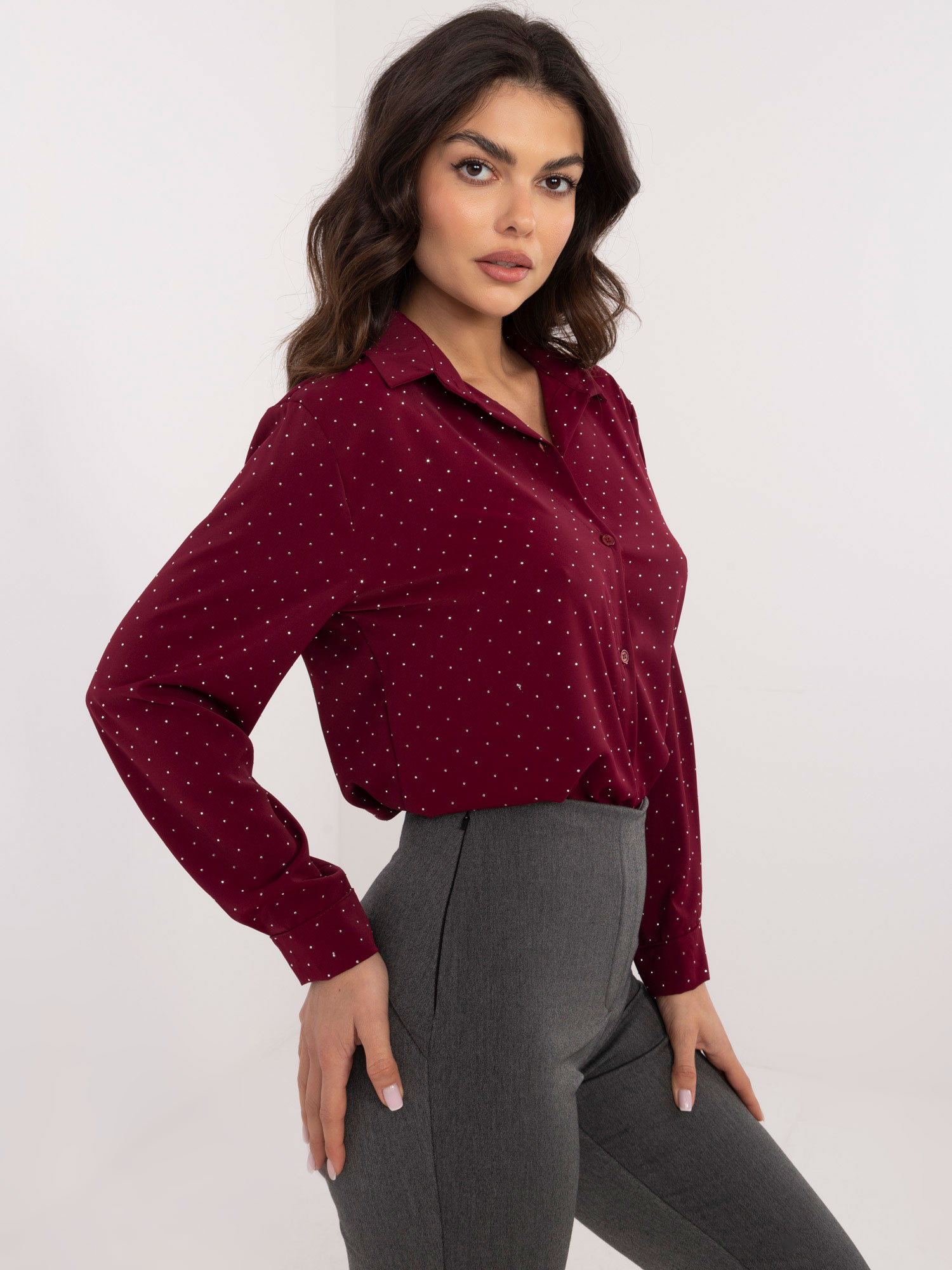 Dámská košile na knoflíky, s dlouhým rukávem, pošitá stříbrnými kamínky. Materiálové složení: 70% Polyester, 30% Viskóza Modelka má na sobě jednu velikost. míry modelky: výška 173 cm, prsa 85 cm, pas 62 cm, boky 95 cm. Rozměry košile jedné velikosti měřené na plocho: šířka v podpaží - 52 cm, šířka v bocích - 56 cm, délka rukávu - 56 cm (od švu), celková délka - 69 cm.