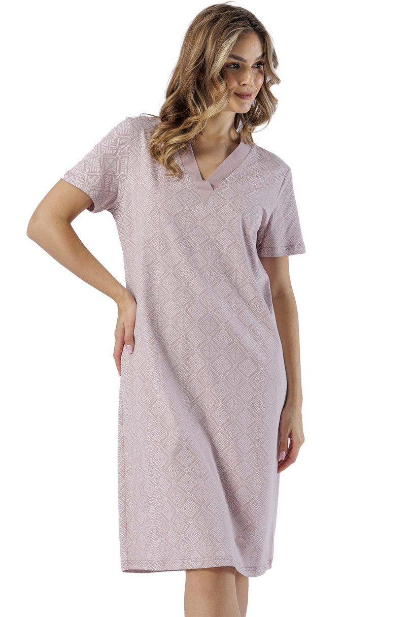 Dámské tričko s krátkým rukávem, vyrobené ze vzorované bavlny, s posádkovým výstřihem a kontrastním lemováním, délka ke kolenům. Složení: 100% bavlna .