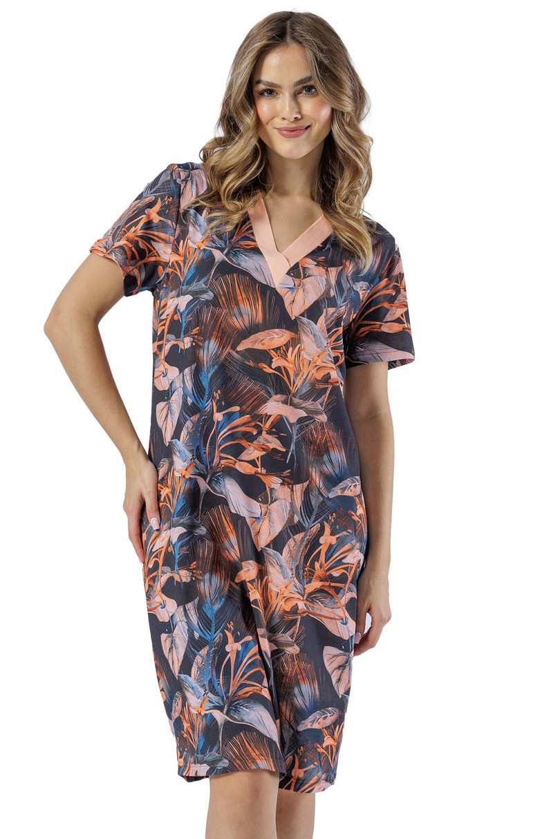 Dámské tričko s krátkým rukávem, vyrobené ze vzorované bavlny, s posádkovým výstřihem a kontrastním lemováním, délka ke kolenům. Složení: 100% bavlna .