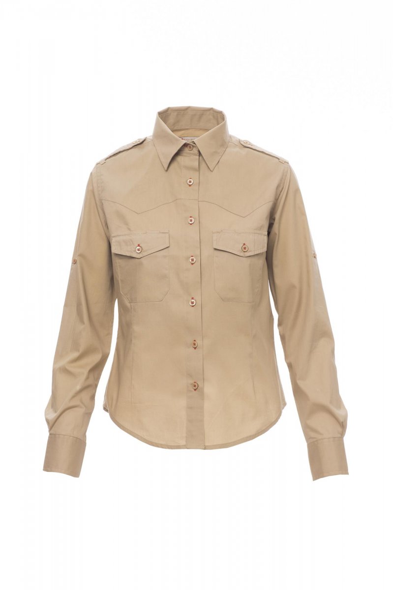 Dámská košile s krátkým rukávem z jemné Cesane bavlněné látky, mírně vyštíhlená, sedlo na přední části, přepínání na barevné sladěné knoflíky s kontrastními knoflíkovými dírkami, nárameníky, dvě kapsy na hrudi s klopou to ocky na tužku, poutko s knoflíkem na rukávu pro Praktické vyhrnování . Košile bílé barvy nemají knoflíkové dírky v kontrastní barvě a sedle v přední části. Ošetření látky snadná péče.