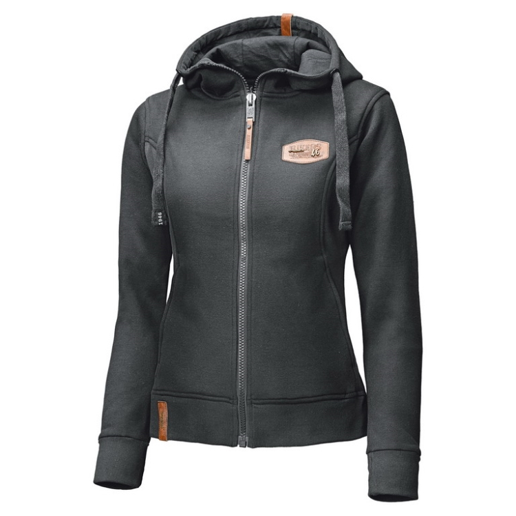 HELD 46 Dámská mikina Vlastnosti: kapuce elastické lemy kolem zápěstí a v pase dvě vnější kapsy zapínání bundy zipem mix bavlny a polyesteru černá Pro další informace kliknětě na odkaz Tabulka velikostí Held Péče a materiály Held