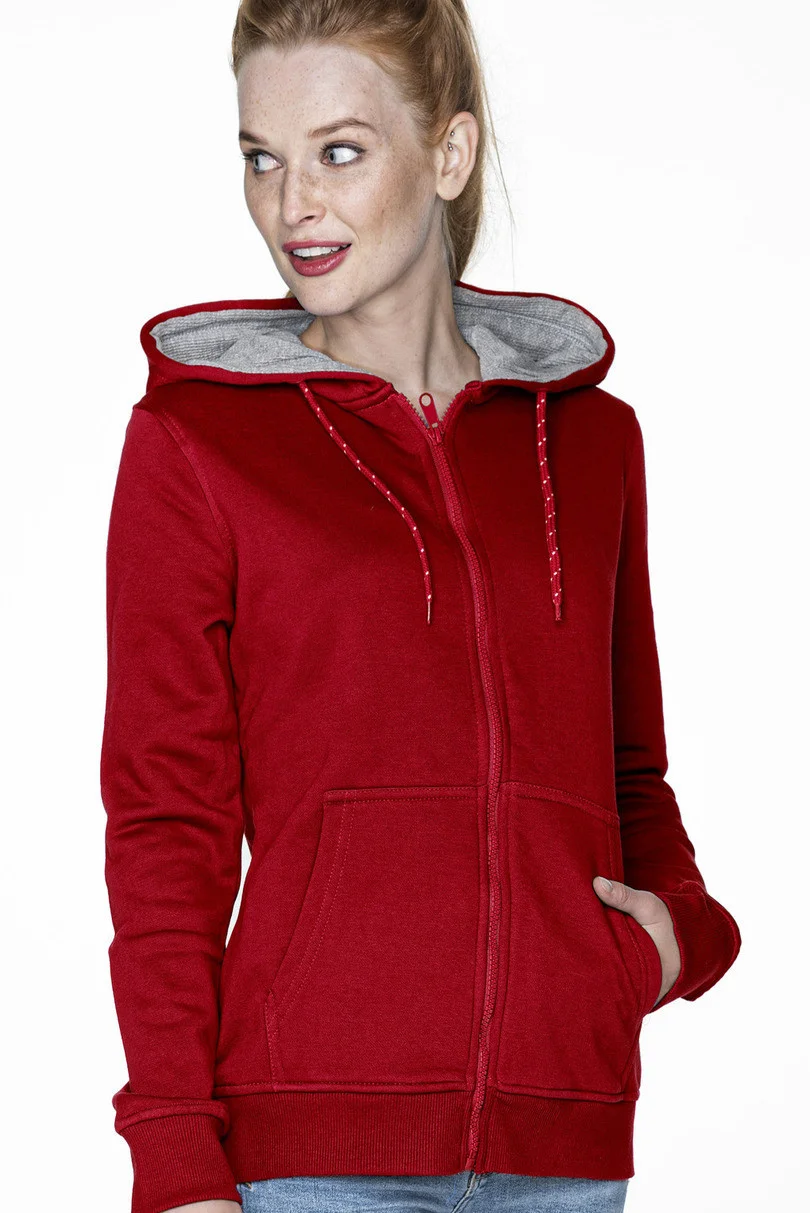 Dámská mikina s kapucí. Vevnitř je česaný materiál, zvenčí má protižmolkující úpravu. Kapuce podšitá kontrastním materiálem. Kapuce má regulaci. Hlavní zip je plastový. Vpředu dvě velké kapsy. Rukávy jsou zakončené elastickým lemem. Složení: 80% bavlna, 20% polyester. Gramáž: 250g/m2