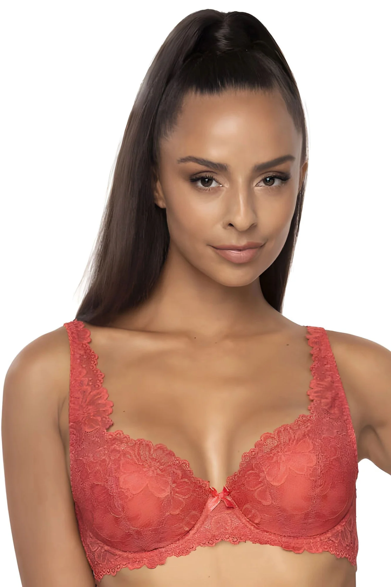 Dámská podprsenka 053/22 Carmela coral MAT - korálová barva - z krajky s květinovým motivem - vyztužená - vnitřní strana košíčků podšitá bavlnou - boční části s kosticí - nastavitelná a neodepínatelná krajková ramínka - nadzvedává a přidržuje poprsíMateriálové složení: 44% polyamid + 18% polyester + 16% bavlna + 16% polyuretan + 6% elastan