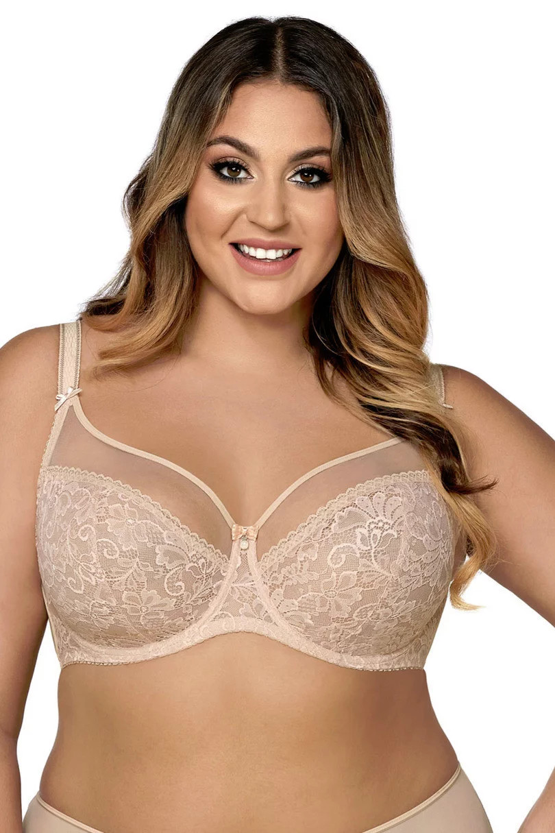 Měkká podprsenka. Vrchní část košíčků je tylová, spodní krajková. Mezi košíčky je ozdobná perlička. Boky jsou ušité z pevné látky a jsou zpevněné kosticí. Ramínka jsou nastavitelná, neodepínací. Zapínání je na zádech na kovové háčky. Materiálové složení: 88% poliamid, 8% bavlna, 4% elastan