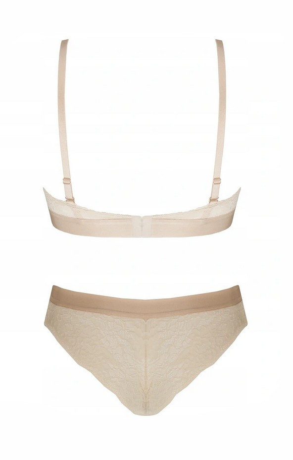 Dámská podprsenka typu "braletka" bez kostic. Podprsenka je vyrobená z italské jemné ekologické krajky. Pod poprsím je měkká, pružná, jemně lesklá guma. Vnitřní část košíčků je obšitá měkkou bavlnou. Ramínka vychází z košíčků, je možné je nastavit a je možné je vzadu odepnout. Podprsenku zdobí zlaté háčky a regulátory. Model se zapíná dvěma háčky s trojí možností nastavení délky obvodu. Pro získání ušlechtilé barvy ecru byl využit přírodní pigment z porostu LaNoce di Galla, který je možné najít v barvě dřeva, listů a kořenů některých rostlin. Složení: 60 % polyamid, 20 % elastan, 17 % polyester, 3 % bavlna.