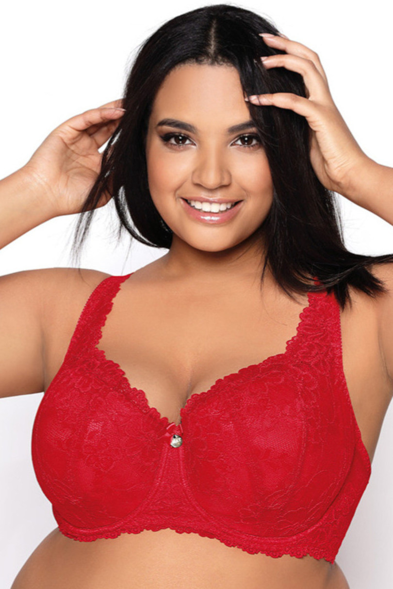 Poloměkká vyztužená krajková podprsenka s květinovým motivem. Vnitřek mísy je vyložen bavlnou. Boky vyztužené vertikální velrybí kostí. Ozdobné, nastavitelné popruhy, neodnímatelné. Model dokonale nadnáší a podpírá poprsí. Složení: 44 % polyamid, 18 % polyester, 16 % bavlna, 16 % polyuretan, 6 % elastan .
