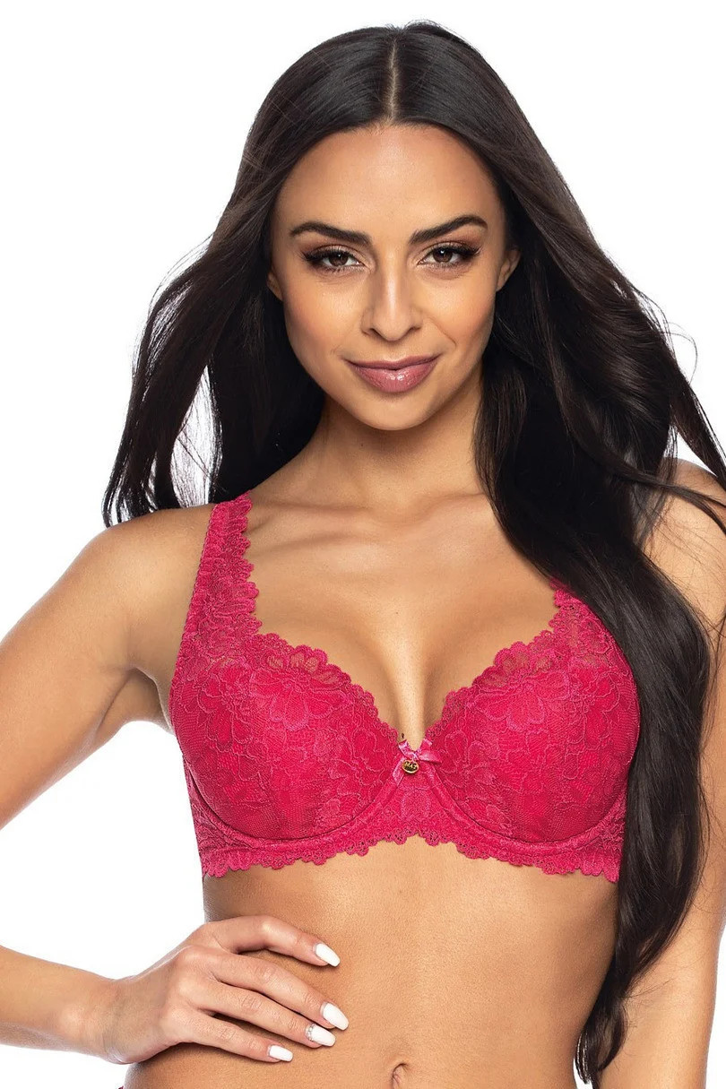 Dámská podprsenka Carmela. Podprsenka působí velmi žensky, je pohodlná a přitahuje pozornost. Tato polovyztužená podprsenka typu "semi-soft" je vyrobená z překrásné krajky. Složení: 44 % polyamid, 17 % bavlna, 17 % polyester, 17 % polyuretan, 5 % elastan.