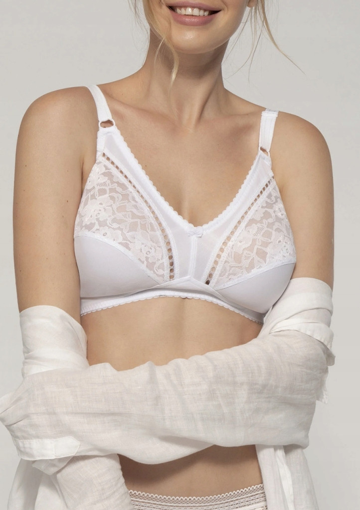 Klasická bezkosticová podprsenka od značky Dorina je určena pro dámy, které mají rady pohodlí. Podprsenka je bezkosticová a maximálně pohodlná. Je zdobená částečně krajkou s květinovým motivem. V oblasti obvodu je zpevněná měkkou gumou, která zajišťuje, aby poprsí drželo v požadované výšce. Má měkká, široká, vpředu délkově nastavitelná ramínka zajišťující své majitelce komfort při jejím nošení. Zapínání je dvouřadové na tři pozice. Materiálové složení : 92% polyamid, 8% elastan