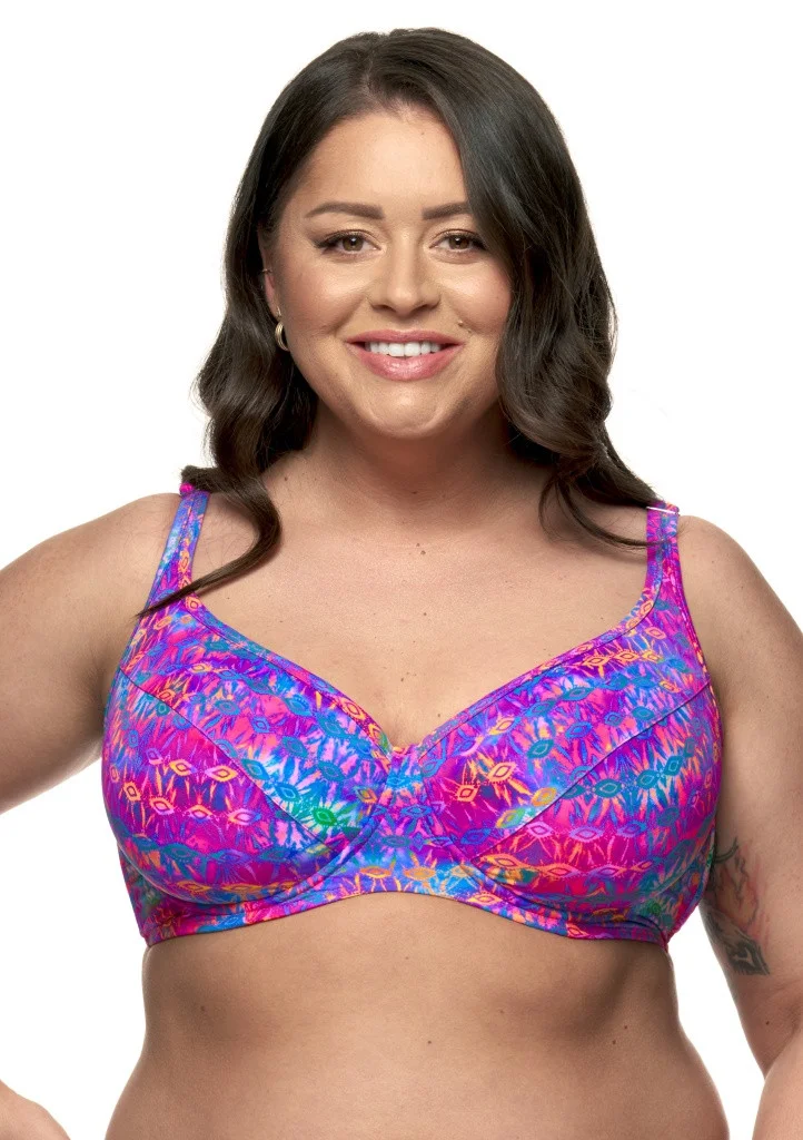 Dámské plavky Fantasy z kolekce Amy. Dámský horní plavkový díl má lehce vyztužené podšité košíčky s kosticemi. Podprsenka má klasický střih s vyšším středem a je vhodná i pro větší poprsí. Širší ramínka jsou pevně všitá, délkově lehce nastavitelná. Obvod podprsenky je vyšší, vyztužen flexibilními silikonovými kosticemi, které se Vám přizpůsobí. Zapínání je umístěno v zadní části obvodu pomocí kovové spony. U těchto plavek lze libovolně kombinovat spodní a horní díl z dané kolekce. Materiálové složení: 80% polyamid, 20% elastan.