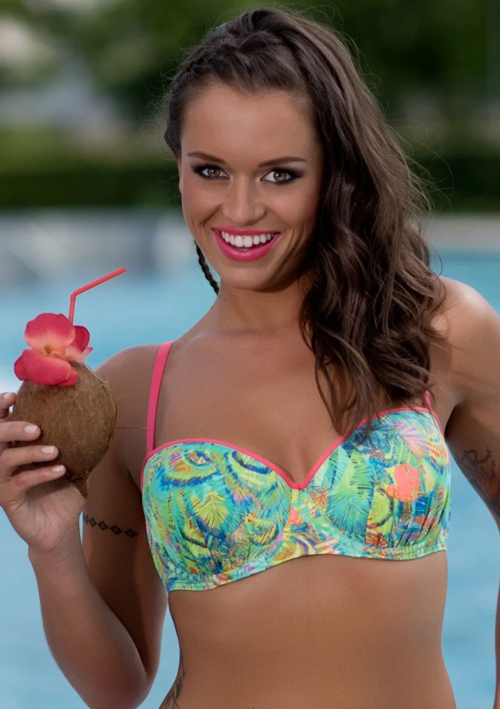Dámská plavková podprsenka značky Fantasy. Podprsenka má push-up výztuž, pestrobarevné zbarvení lemuje výrazný zelený lem. Ramínka se dají odepnout a lze ji nosit jako korzetovou podprsenku. Vzadu je na kovové zapínání. Plavky jsou české výroby. Materiálové složení: 85% polymaid, 15% elastan