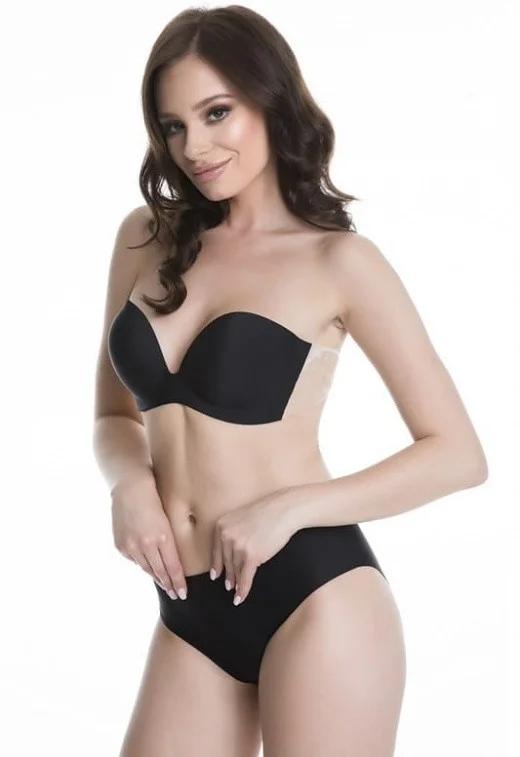 Dámská samodržící podprsenka s push-up efektem je ideální nejen v plesové sezóně,ale můžete ji nosit pod různé typy oblečení. Hladké polstrované košíčky se pomocí průhledných lepivých pásků přilepují k tělu na bocích. Díky vrstvě atestovaného silikonového lepidla podprsenka krásně drží prsa. Po umytí lepící vrstvy je možné podprsenku Wings!bra nosit opakovaně. Dostupné velikosti košíčků: A - D. Materiálové složení: 95 % polyuretan, 3 % polyester, 2 % silikon.